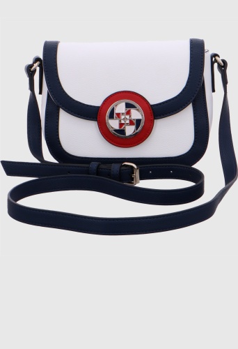 Бело-голубая вечерняя сумочка с эффектным декоративным орнаментом. Клапан закрывается на кнопку. Просторное основное отделение закрывается на молнию. Внутри сумки есть карман на молнии и маленькие кармашки. Карман на молнии сзади предлагает дополнительное место для хранения. Практичный плечевой ремень регулируется пряжкой.