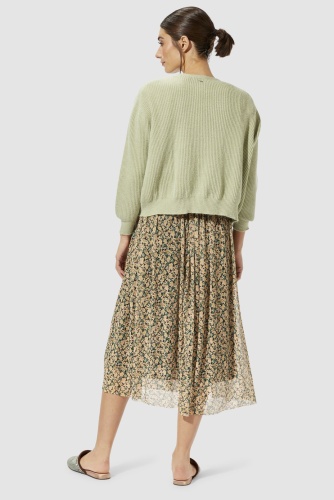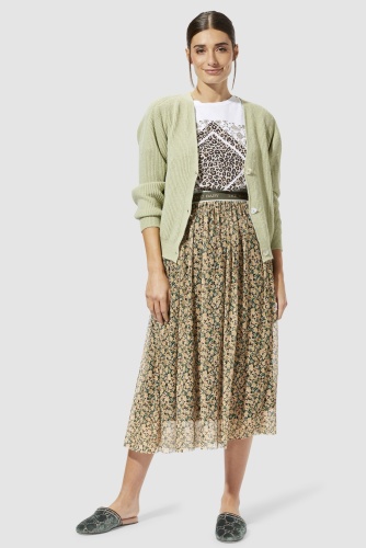 Двуслойная шифоновая юбка длины миди выполнена в цветочном узоре. Эластичный пояс обеспечивает комфортную посадку и удобство повседневного ношения.