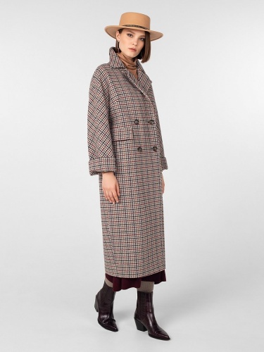 Двубортное пальто силуэта "длинный кокон" длиной до середины икры. Рукава-кимоно с отворотом по низу, застёжка на роговые пуговицы, английский воротник, карманы с декоративными клапанами, широкая отлетная кокетка на спинке, шлица в среднем шве. Произведено с ветрозащитной мембраной Raft Pro. Изготовлено из шерстяной ткани с рисунком "пье-де-пуль".