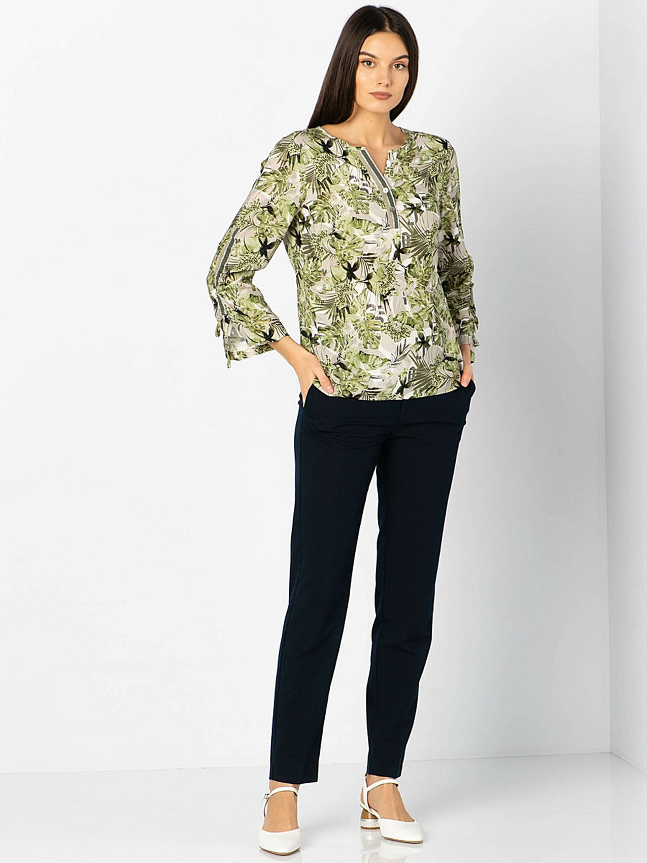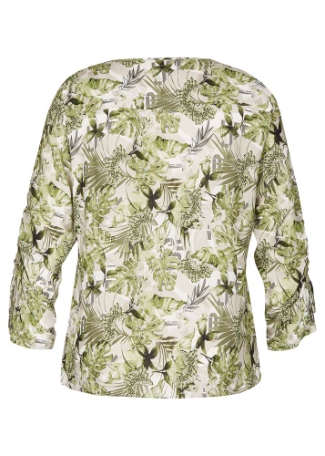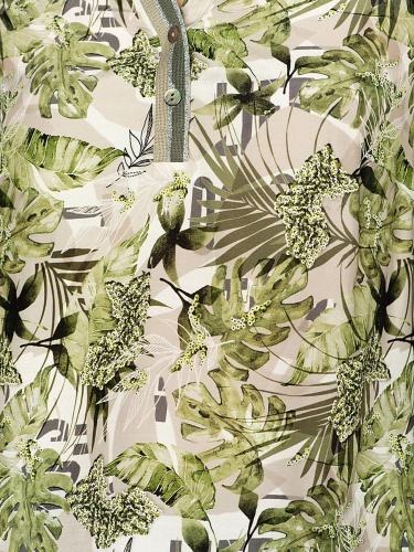 • свободный покрой • трендовый принт с тропическими мотивами • приятный к телу вискозный материал • застежка на пуговицах • длина изделия по спинке: 65 см.