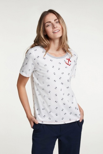 Для тех, кто скучает по морю! Футболка с принтом в виде якорей и украшением из бисера. Прямой крой. Широкий круглый вырез горловины с обтачкой, короткие рукава с фиксированными манжетами. Контрастная отстрочка по низу изделия. Хлопковый материал приятен к телу и обеспечивает комфорт. Эта футболка - прекрасный компаньон для образа как с брюками, так и с юбкой.