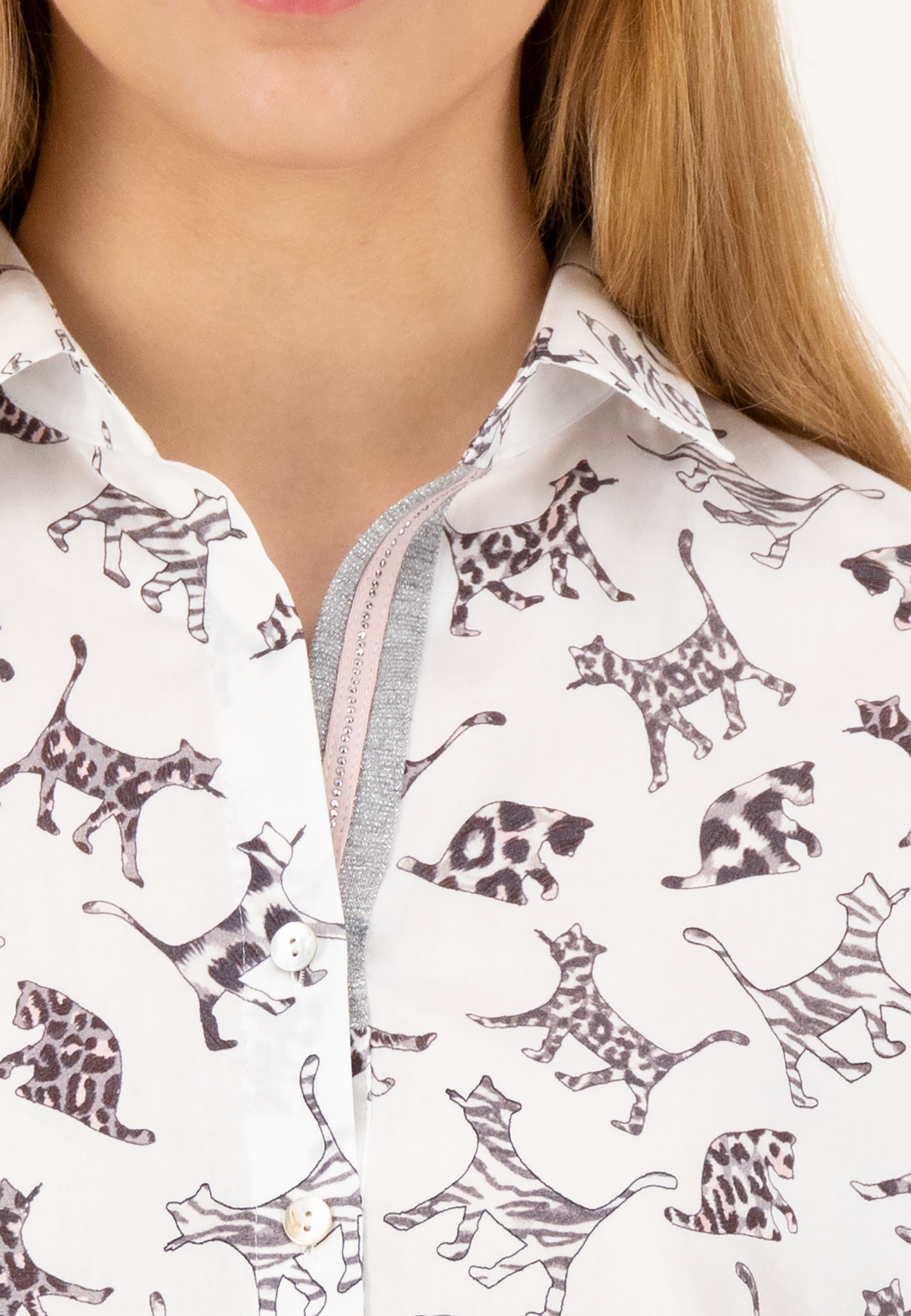 На сайте указаны российские размеры. Современная белая блуза с рубашечным воротником и принтом по всей поверхности. Классическая посадка с закругленным краем, манжетами рукавов и воротником рубашки. Блузка с длинными рукавами легко струится благодаря складкам на спине. Еще одной изюминкой блузки является декорированная подкладка из люрекса с декоративной лентой розового цвета и нежными стразами. Модель ростом 177 см. Измерения для 44 размера: Окружность груди: 123 см Талия: 121 см Бедра: 130 см Длина по спинке: 72 см. Длина рукава: 60 см.