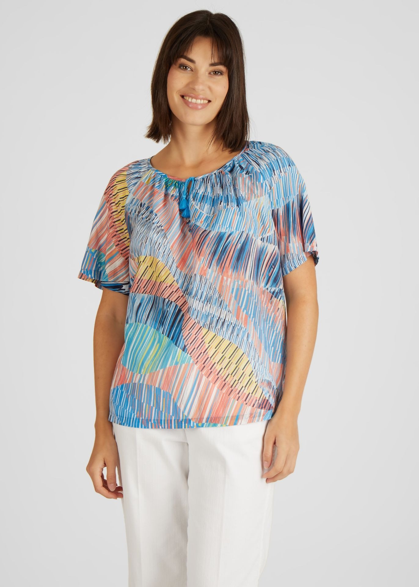 Блузка с короткими рукавами и абстрактным узоро. Небольшой V-образный вырез можно уменьшить до небольшого модного разреза с помощью ленточек на воротнике. Широкая форма придает непринужденный вид, а струящаяся ткань приятна на ощупь. Носите блузку небрежно с джинсами или брюками.
