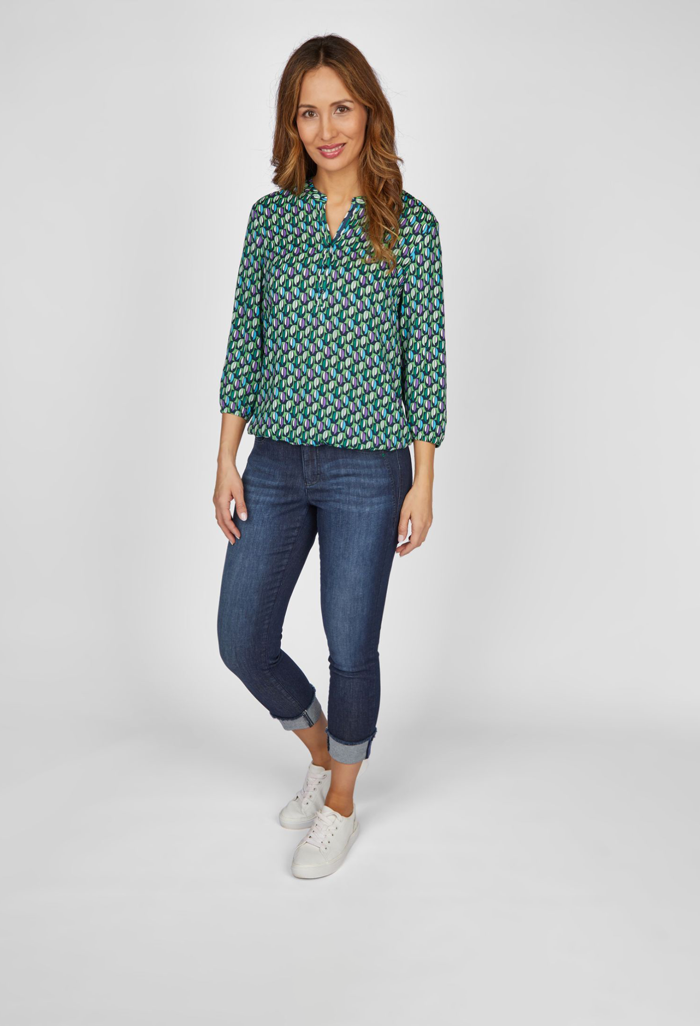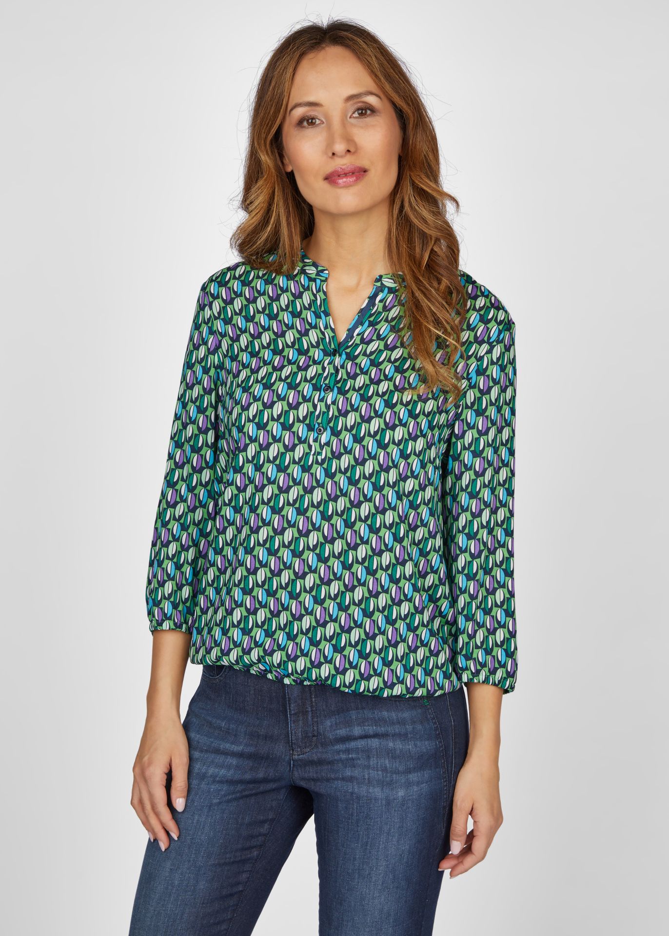 Блузка с минималистичным узором по всей поверхности – стильный и универсальный предмет гардероба. Изготовленная из высококачественной 100% вискозы, она обеспечивает ощущение комфорта и легкую, струящуюся текстуру. Блузка имеет небольшой воротник-стойку и элегантную планку на пуговицах, что придает ей классический и привлекательный вид. Эластичный низ обеспечивает удобную посадку и подчеркивает талию. Эластичные манжеты на рукавах придают изделию изысканность и позволяют персонализировать модель. Эта блузка с тонким узором по всей поверхности придаст любому образу утонченную элегантность.