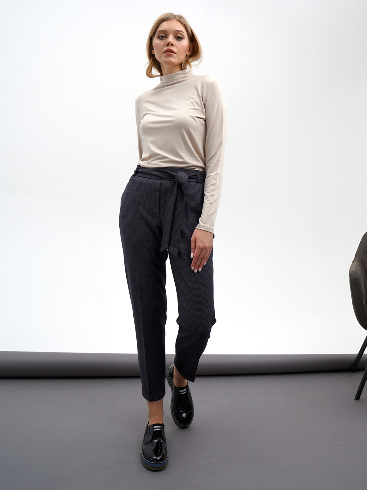 На сайте указаны российские размеры. Укороченные брюки в клетку подходят как для делового, так и для городского повседневного образа. Стрелки визуально вытягивают рост. Комфортная средняя посадка, притачной пояс со шлевками. В комплекте идет тканевый пояс из основного материала изделия. Крой: стильные брюки актуальной длины 7/ 8 имеют высокую посадку, которая подчеркивает линию талии и визуально делает ее тоньше. Прямой зауженный силуэт создает идеальную вертикаль, которую усиливают и стрелки – образ становится вытянутым и стройным. Удобные карманы по бокам позволяют спрятать в себя самые необходимые предметы – телефон, ключи и банковские карты. В задней части брюк присутствуют нефункциональные карманы-рамочки, которые добавляют женственности. Отделка: завязной пояс – украшение модели. Его можно завязать как стильным узлом, там и романтичным бантом и подчеркнуть красоту талии. В нижней части модели расположены манжеты, которые подчеркивают изящество щиколоток.