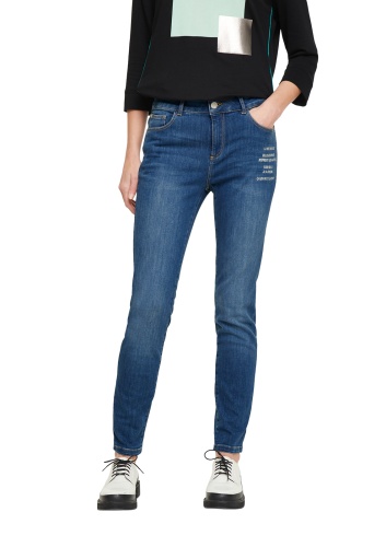 Зауженные джинсы с потертостями и принтом. Высокая посадка, пояс со шлевками. Внутренние передние и задние накладные карманы. Застежка на скрытую молнию и пуговицу.
