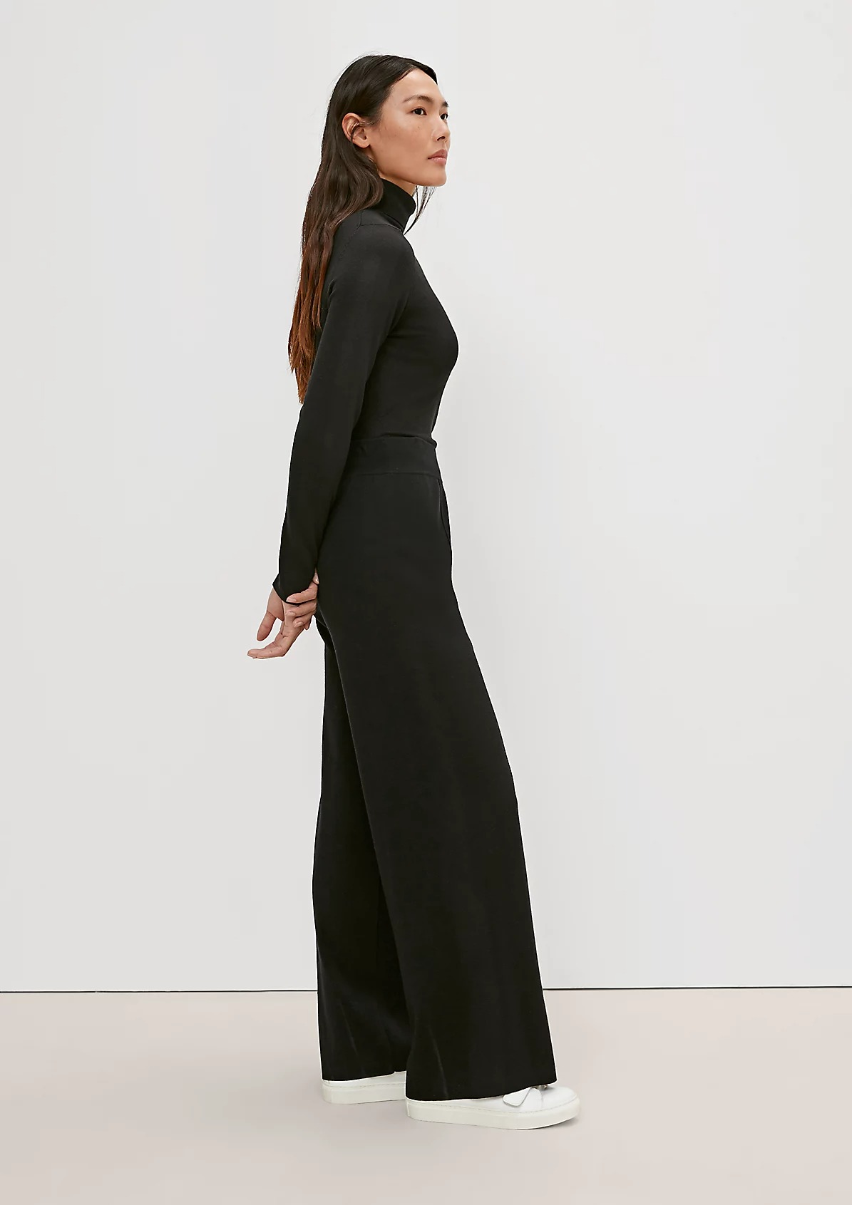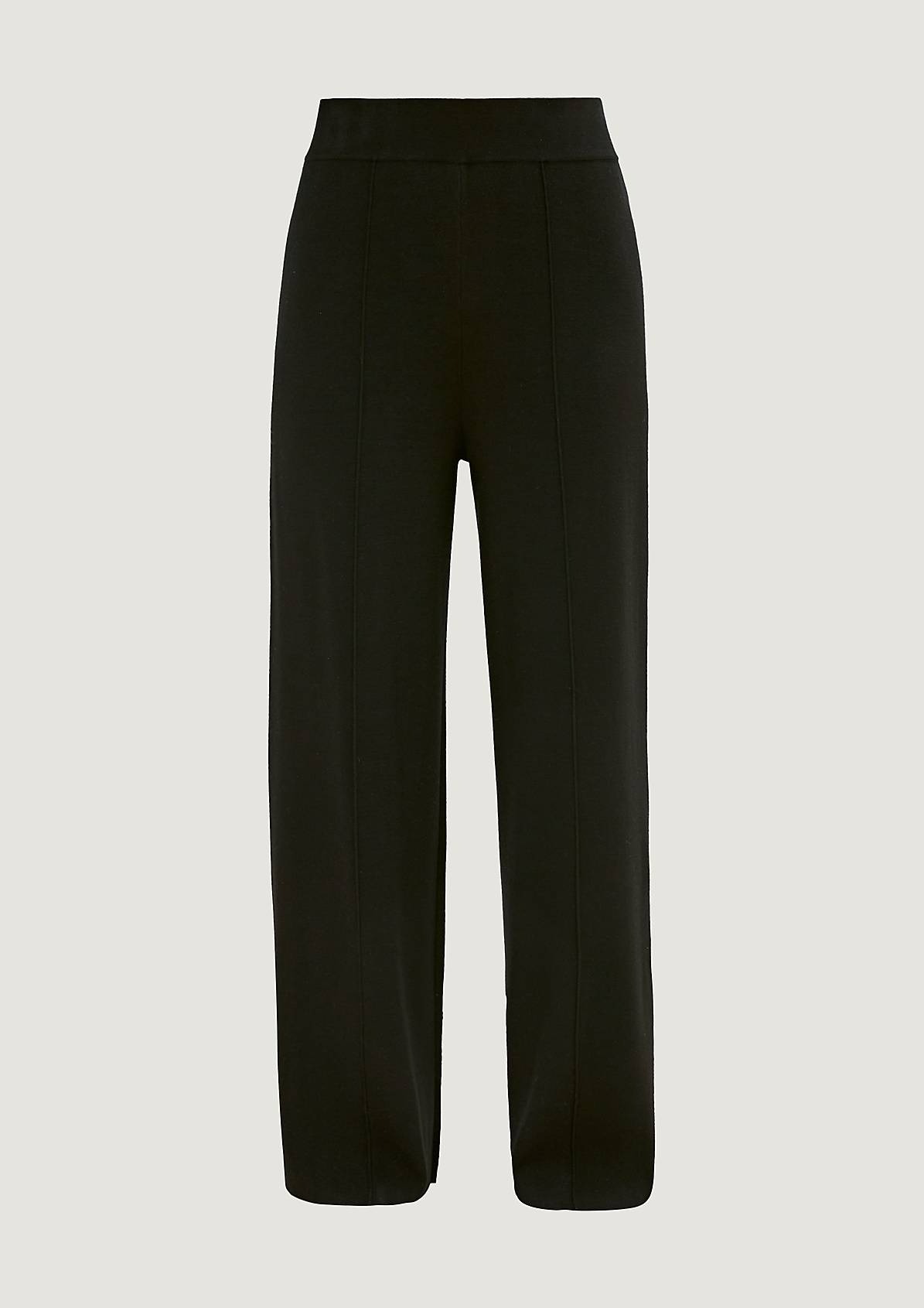 На сайте указаны российские размеры. Брюки-кюлоты из тонкого трикотажа прямой формы. Пояс на резинке. Внутренняя длина штанины составляет около 76 см для размера 42. Рост модели 175 см.