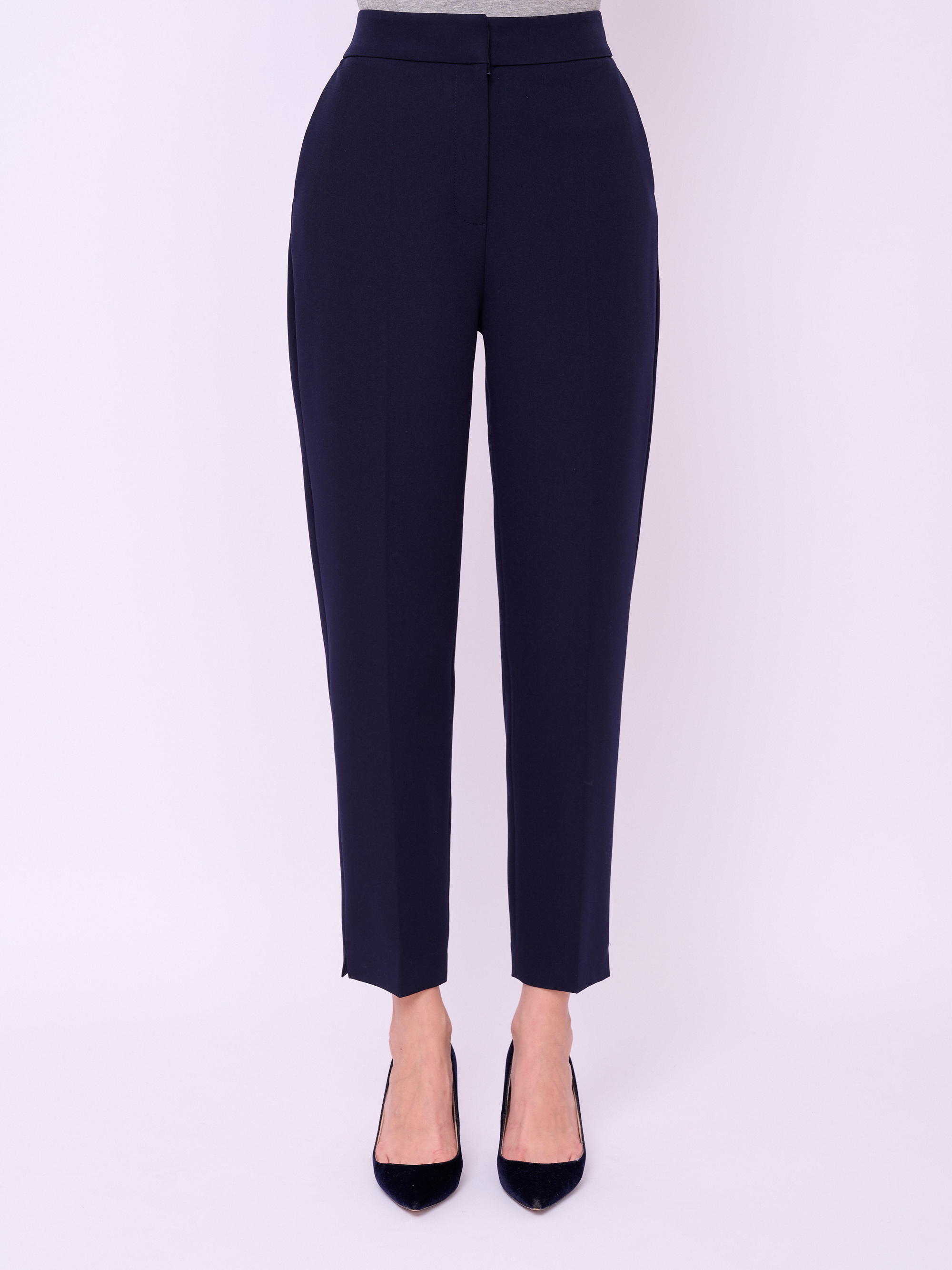 Брюки классические зауженного покроя из текстиля на молнии и резинке с косыми карманами, стрелками и небольшими боковыми разрезами по низу брючин. Длина брючин: 70 см.