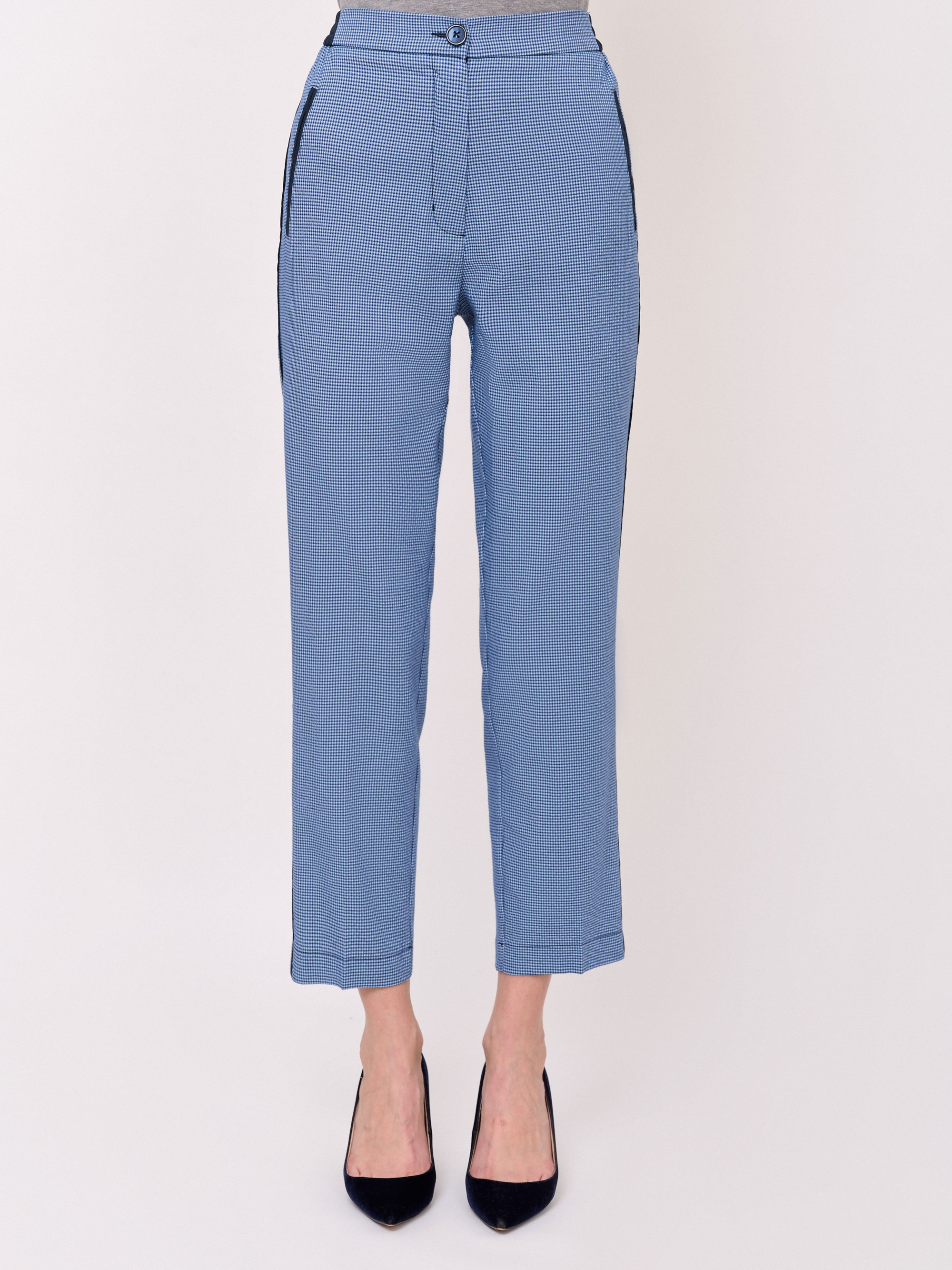 Детали: застежка молния, бокове эластичные вставки на поясе, рисунок клетка, без карманов, крой брючин зауженный, посадка средняя. Длина брючин: 70 см.
