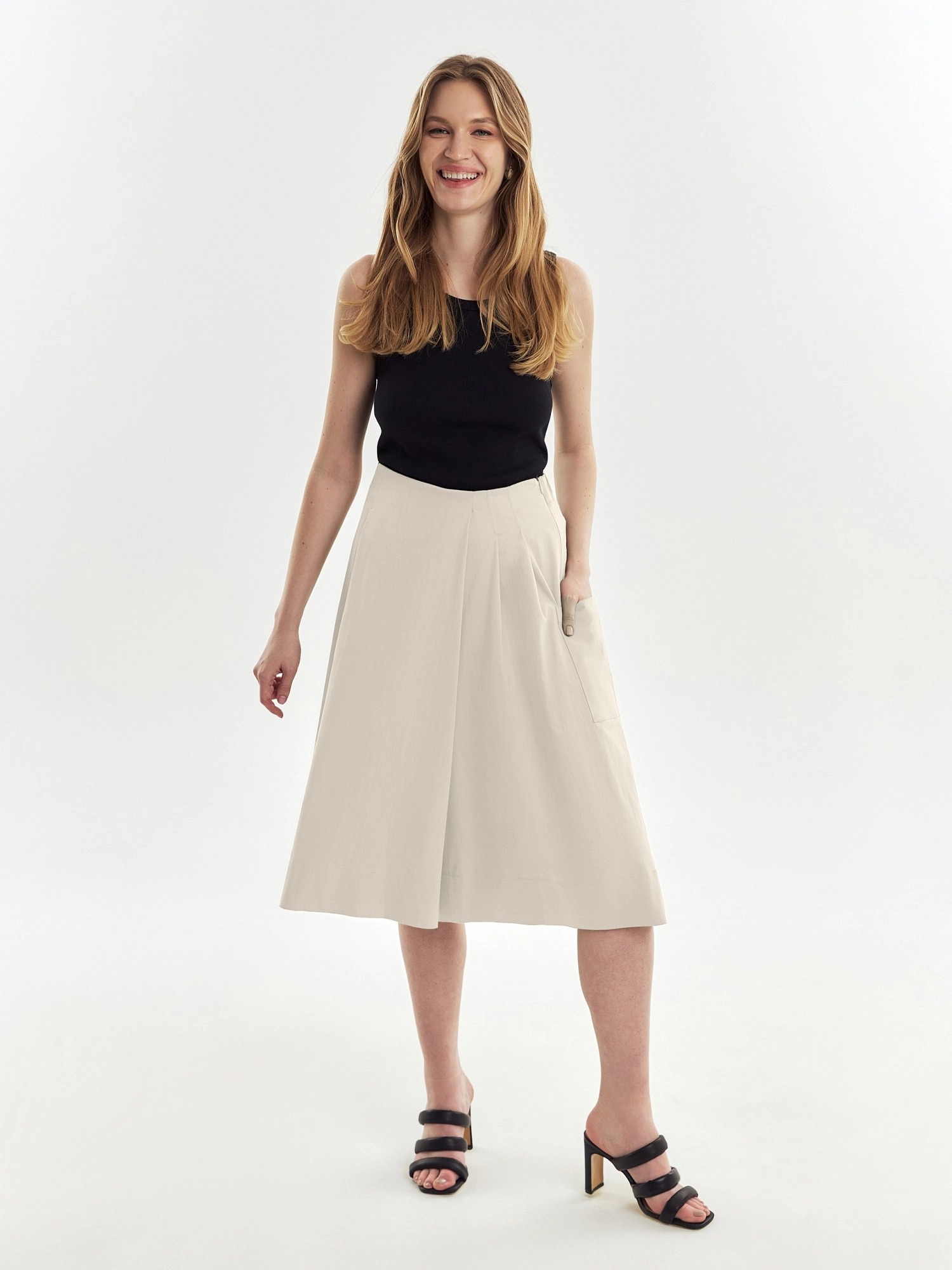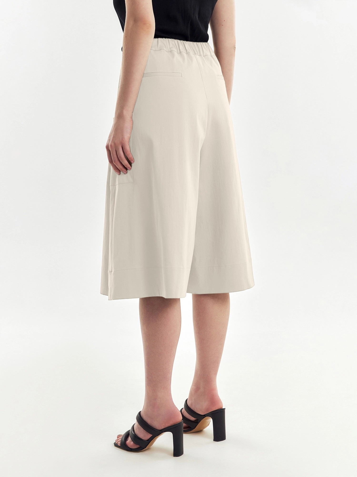 Длинные шорты из хлопковой ткани с запахом и складками по переду имитирующими юбку. На спинке резинка для лучшей посадки. Спереди складки, по бокам большие накладные карманы.
