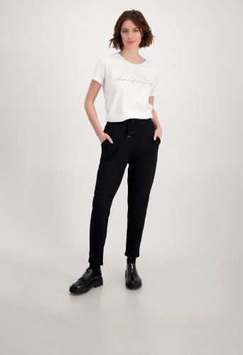 На сайте указаны российские размеры. Спортивные, элегантные и женственные: джоггеры от monari. Брюки выполнены из струящейся смесовой вискозы и обещают удобную посадку не только благодаря эластичности, но и благодаря повседневному крою с нормальной посадкой. Эластичный ребристый пояс с кулиской, люверсами и завязками, а также вставки из ткани в тон с оверлочными швами по бокам и боковые карманы стильно украшают модель. Тиснение тон в тон в виде объемной надписи определяет дизайн правой штанины и делает каждый ваш наряд изюминкой. Рост модели 178 см.