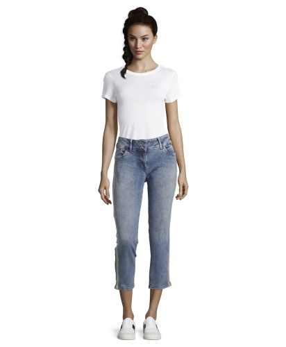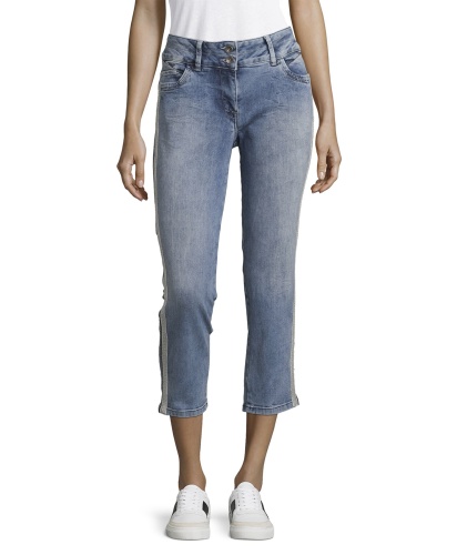 Укороченные потертые джинсы обращают на себя внимание. Универсальная средняя посадка, прямой крой. Длина брюк позволяет подчеркнуть модную обувь. Отделка тесьмой вдоль боковых швов. Материал из хлопковой смеси приятен к телу и обеспечивает комфорт. Эти джинсы - отличный вариант низа для множества образов в стиле кэжуал.