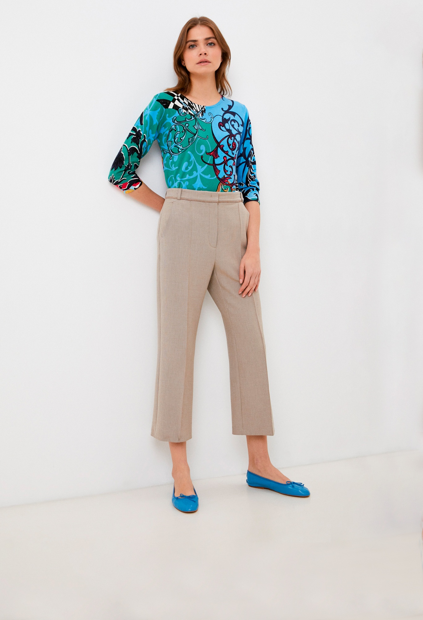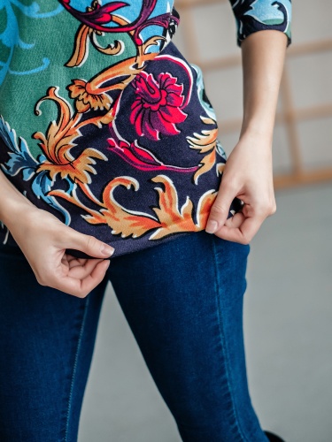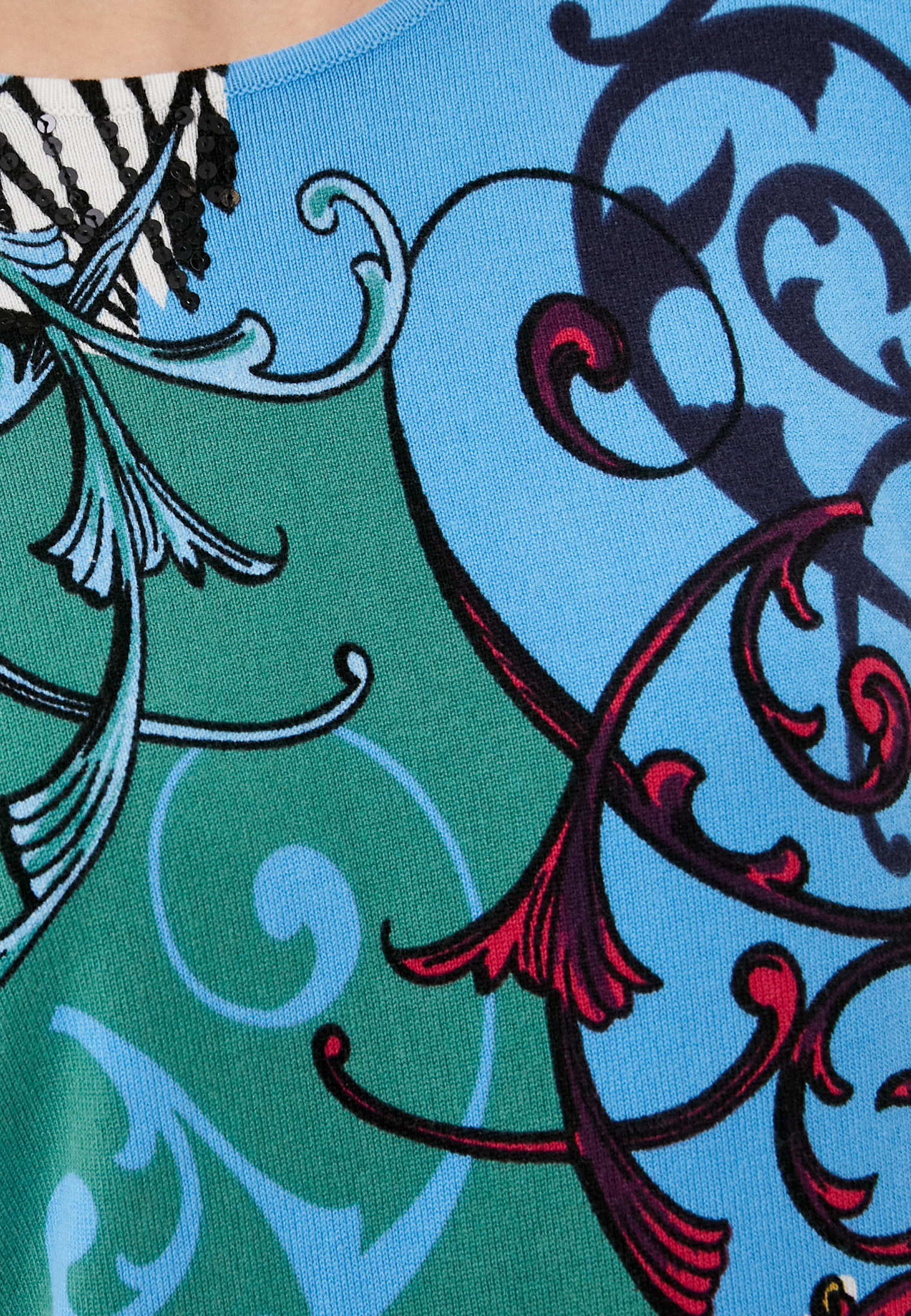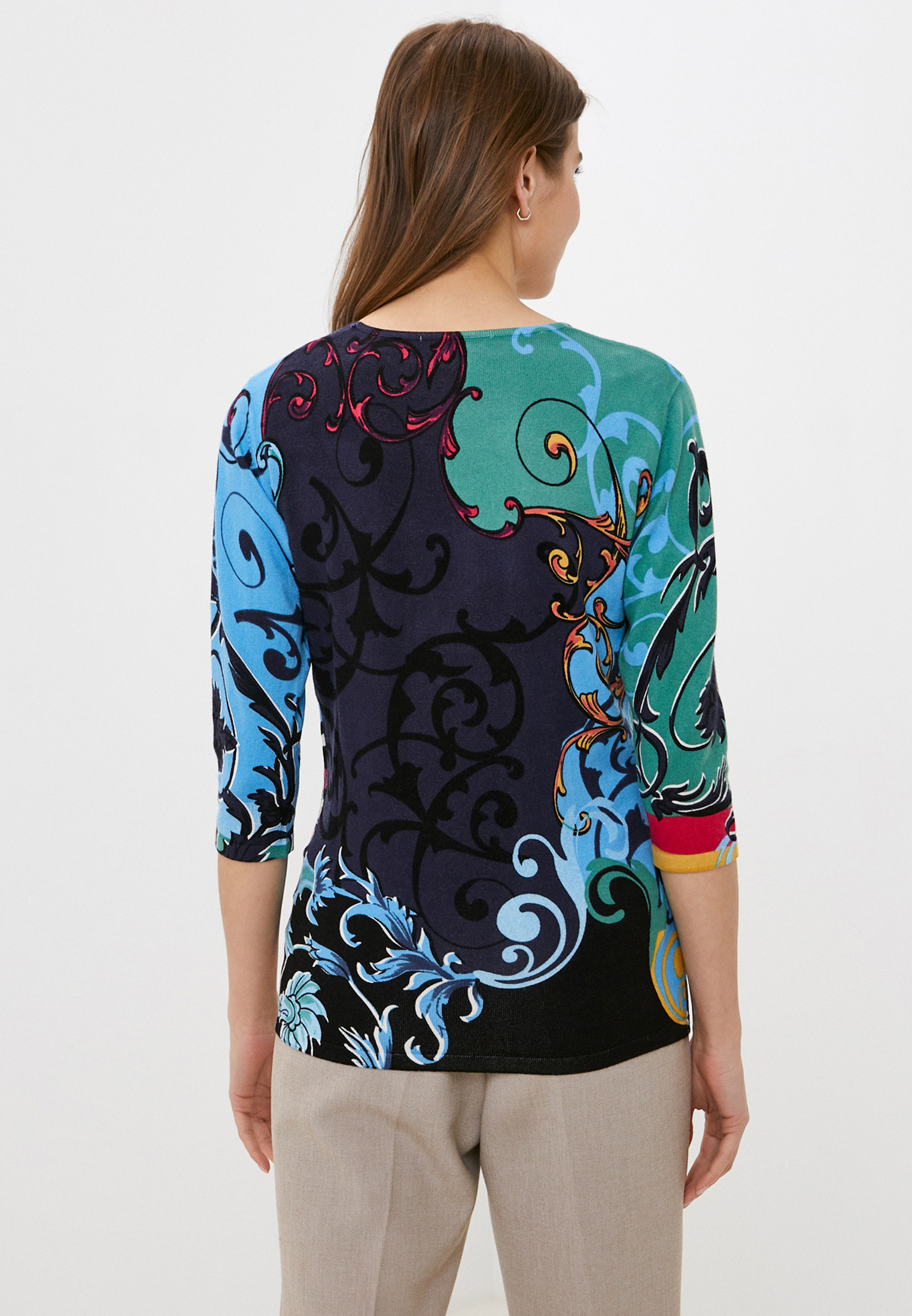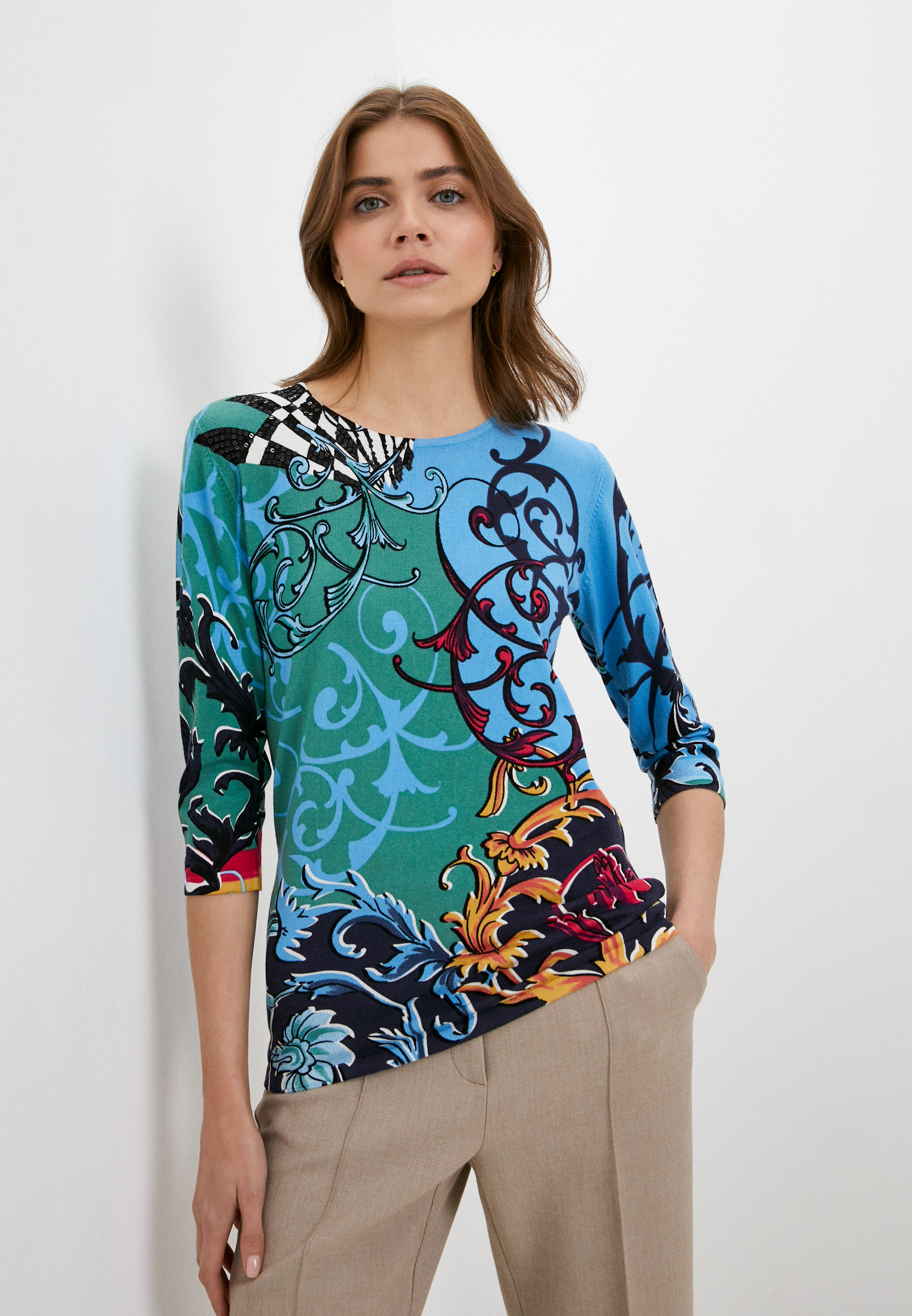 На сайте указаны Российские размеры. Теплый джемпер обращает на себя внимание благодаря контрастному принту. Прямой покрой, круглый вырез горловины, втачные рукава 3/4. Завершает яркий дизайн декор из пайеток. Приятный к телу материал из смеси вискозы и хлопка обеспечивает комфорт.