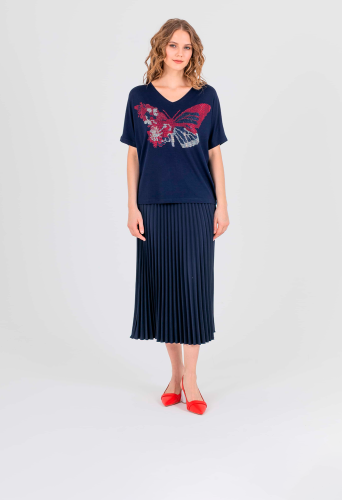 На сайте указаны российские размеры. Оверсайз футболка средней длины прямого силуэта из легкой, мягкой вискозы с добавлением эластана. По переду выполнена яркая аппликация из страз. Укороченные цельнокроеные рукава. V-образный вырез горловины, обработанный трикотажной косой бейкой.