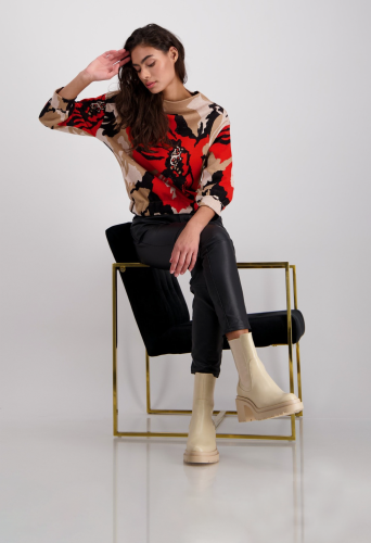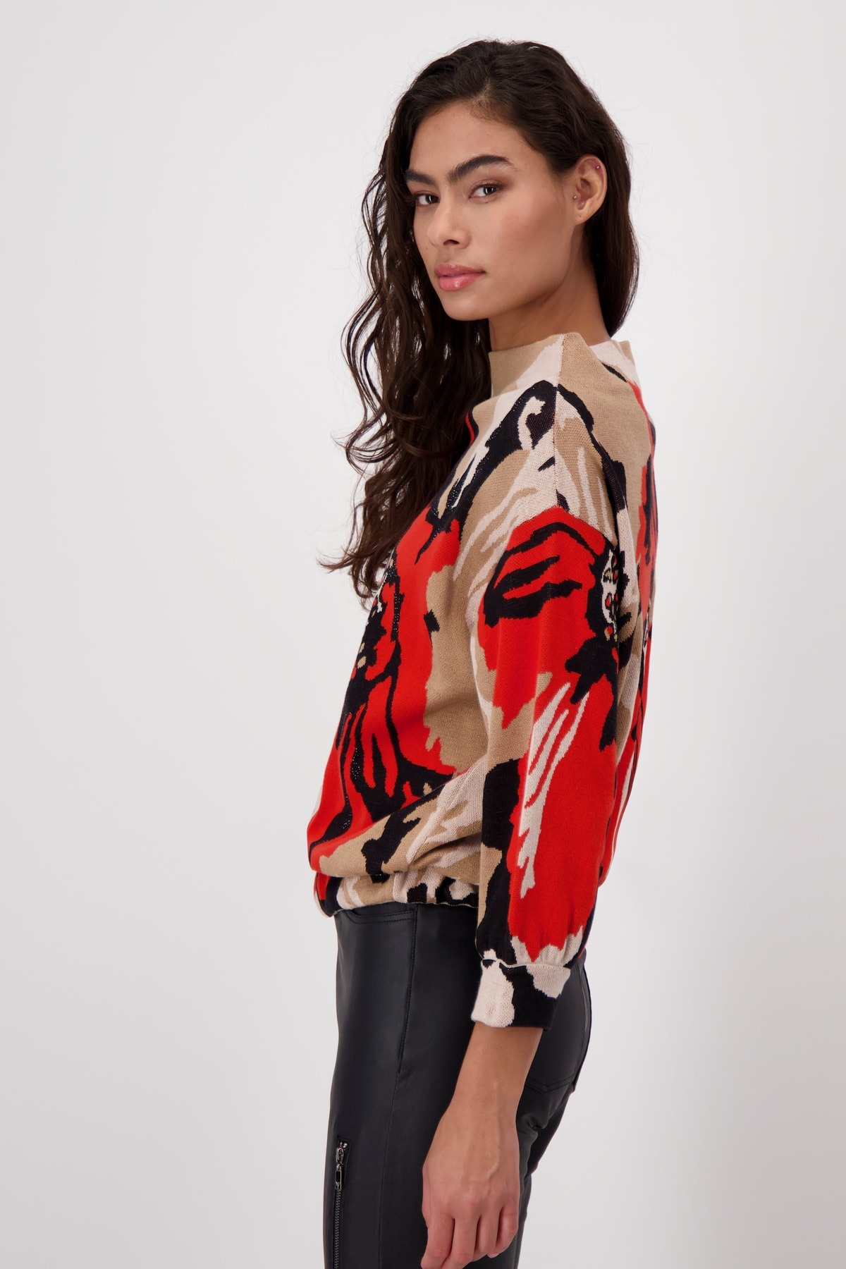 Удобный хлопковый свитер впечатляет красивой жаккардовой тканью с цветочным узором. Цветочный узор украшен сверкающими стразами. Регулярная посадка, воротник-стойка. Манжеты с рюшами. Длина 44 размера 56 см.