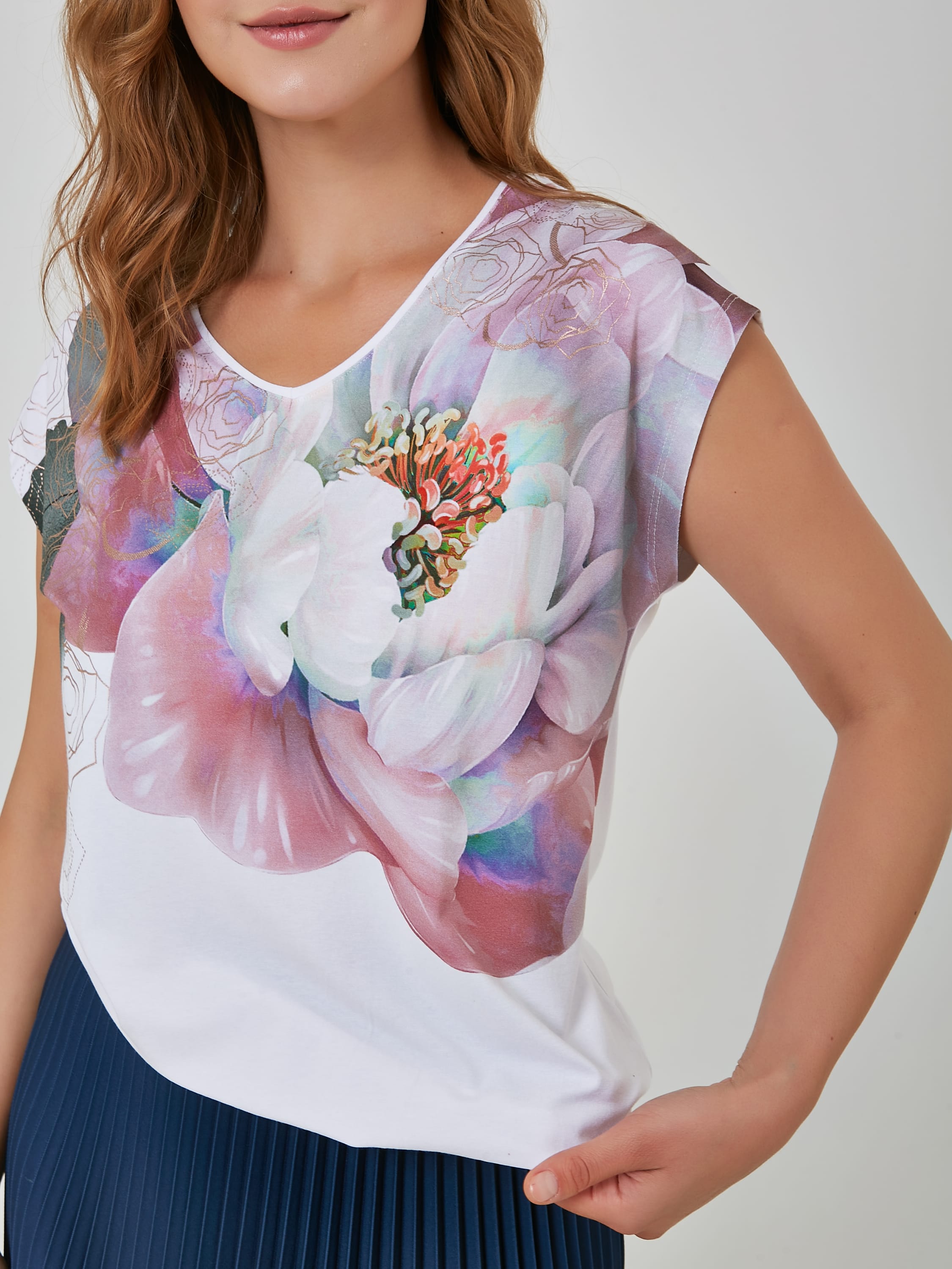 Джемпер с глубоким V-образным вырезом и флораьным рисунком.