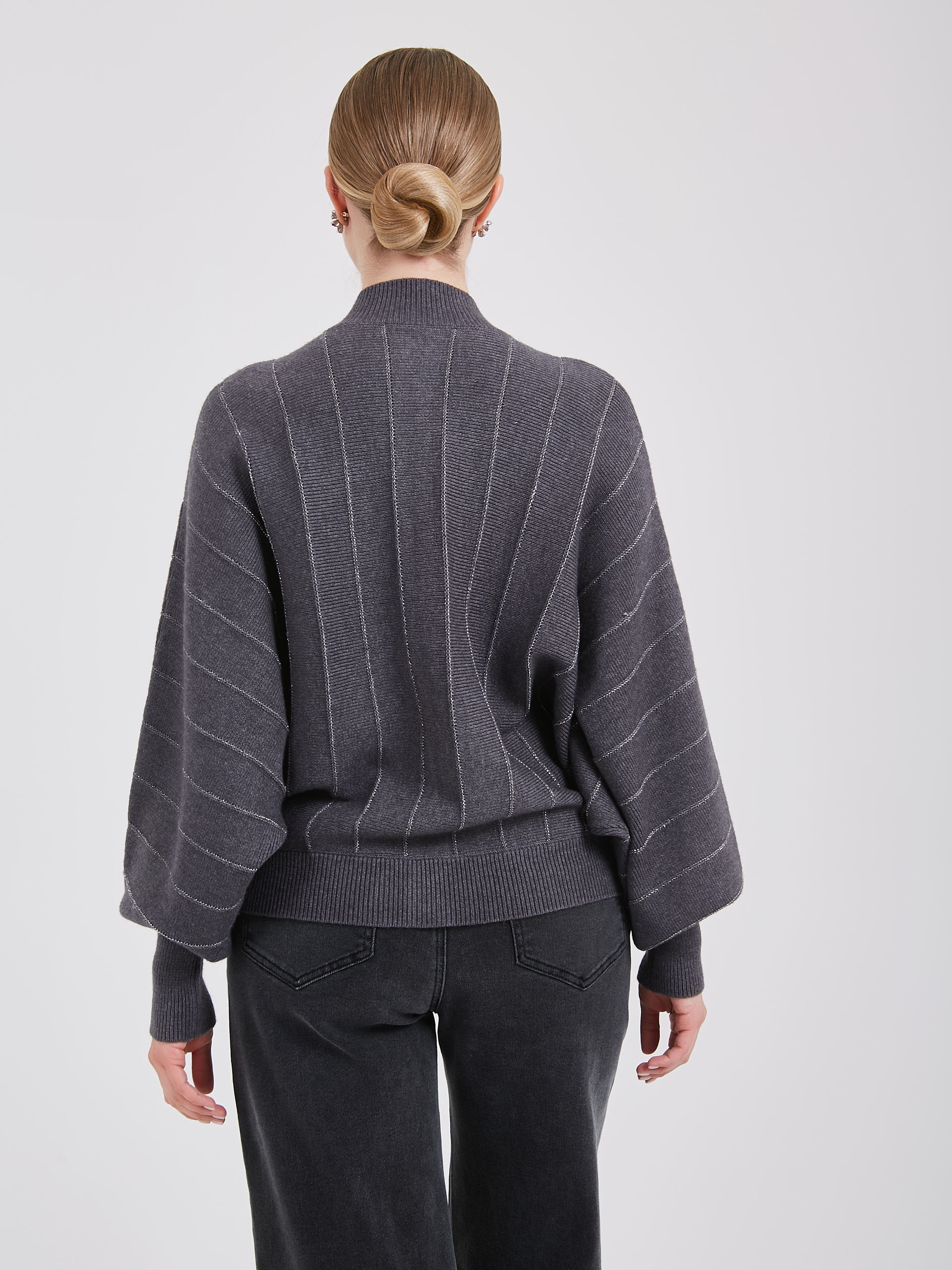 Серый кардиган с объемными рукавами и аккуратными вертикальными полосами придают изделию современный вид. Застежка на пуговицах позволяет регулировать степень открытости горловины, создавая индивидуальный стиль. Универсальность модели делает её отличным выбором для повседневных образов и прохладных вечеров.Осень-Зима'25/26. Капсула "Вишневый сад"