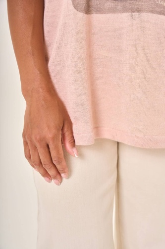 Свободная блузка пастельно-розового оттенка с коротким рукавом и круглым вырезом. Центральное внимание привлекает крупный прямоугольный принт на передней стороне — изящный рисунок слона, выполненный в стилистике классической гравюры. Изящный дизайн и приятный к телу материал делают эту блузку идеальным выбором для создания легкого и романтичного образа.