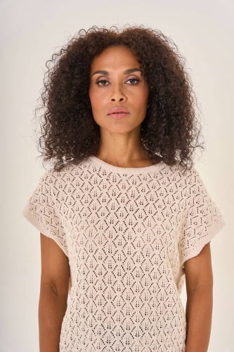 Бежевая вязаная кофта с короткими рукавами. Рельефный узор в виде ромбов добавляет изделию выразительности и уникальности. Мягкий натуральный материал обеспечивает комфорт. Универсальная модель прекрасно дополнит любой наряд, придавая ему уютный и гармоничный вид.
