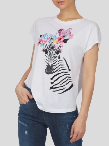 Белая футболка с оригинальным анималистичным принтом. Свободный силуэт, цельнокроеный короткий рукав. Материал из 100%-го хлопка приятен к телу и обеспечивает комфортное ношение.