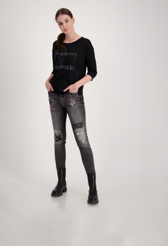 На сайте указаны российские размеры. Футболка из джерси с рукавами 3/4 и стразами. Форма: прямой крой с манжетами на концах рукавов и вставкой на круглом вырезе горловины. Высококачественная смесь хлопка и модала обеспечит комфорт в течение всего дня. Вы не должны обходиться без этого. Модель ростом 179 см.