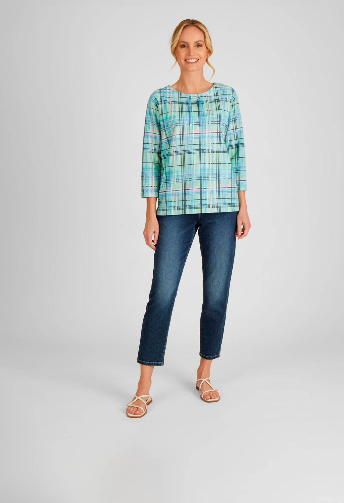 На сайте указаны российские размеры. Футболка в клетку с небольшим воротником-стойкой — must have в вашем гардеробе. Рукава 3/4 и прямой крой гарантируют удобную посадку. На сдержанном воротнике-стойке небрежная кордовая тесьма. Эту толстовку легко комбинировать с любимыми брюками. Длина по спинке от плеча для размера 46: 64 см. Рост модели 176 см.