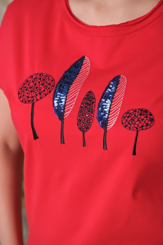 Ткань из натуральных материалов обеспечит комфорт и прохладу жарким летом. Круглый вырез горловины создает женственный образ. Короткие цельнокроенные рукава делают модель более женственной. Полуприлегающий покрой подчеркивает изящный силуэт. Футболка украшена вышивкой и пайетками. Данная модель будет хорошо сочетаться с брюками.