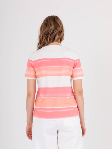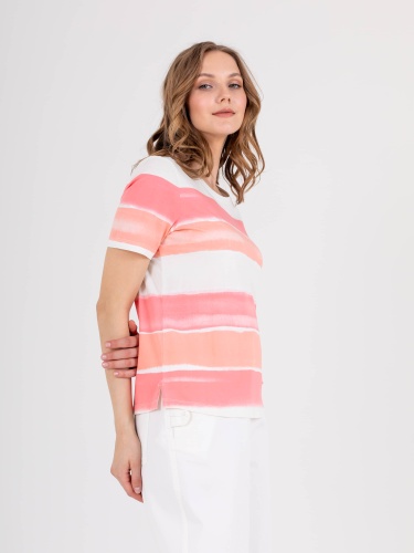Футболка средней длины прямого силуэта из легкого 100% хлопка с разрезами в боковых швах, дизайнерская особенность модели – нежный принт в полоску. Укороченные втачные рукава. Круглый вырез горловины.
