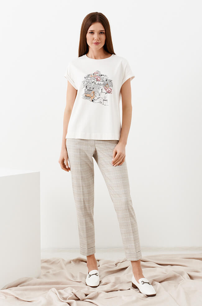 Футболка прямого силуэта, выполнена из трикотажного полотна. Овальный вырез горловины. Слегка спущенная линия плеча с небольшими цельнокроеными рукавами. Удлиненная спинка, боковые швы заканчиваются разрезами. Спереди выполнен дизайнерский принт «Городские мотивы», декорированный пайетками и стразами.