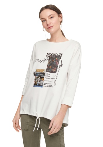 Футболка с принтом. Втачной рукав ¾ со спущенной линией плеча. Кулиска по низу изделия. Материал из смесового хлопка приятен к телу и комфортен в ношении.