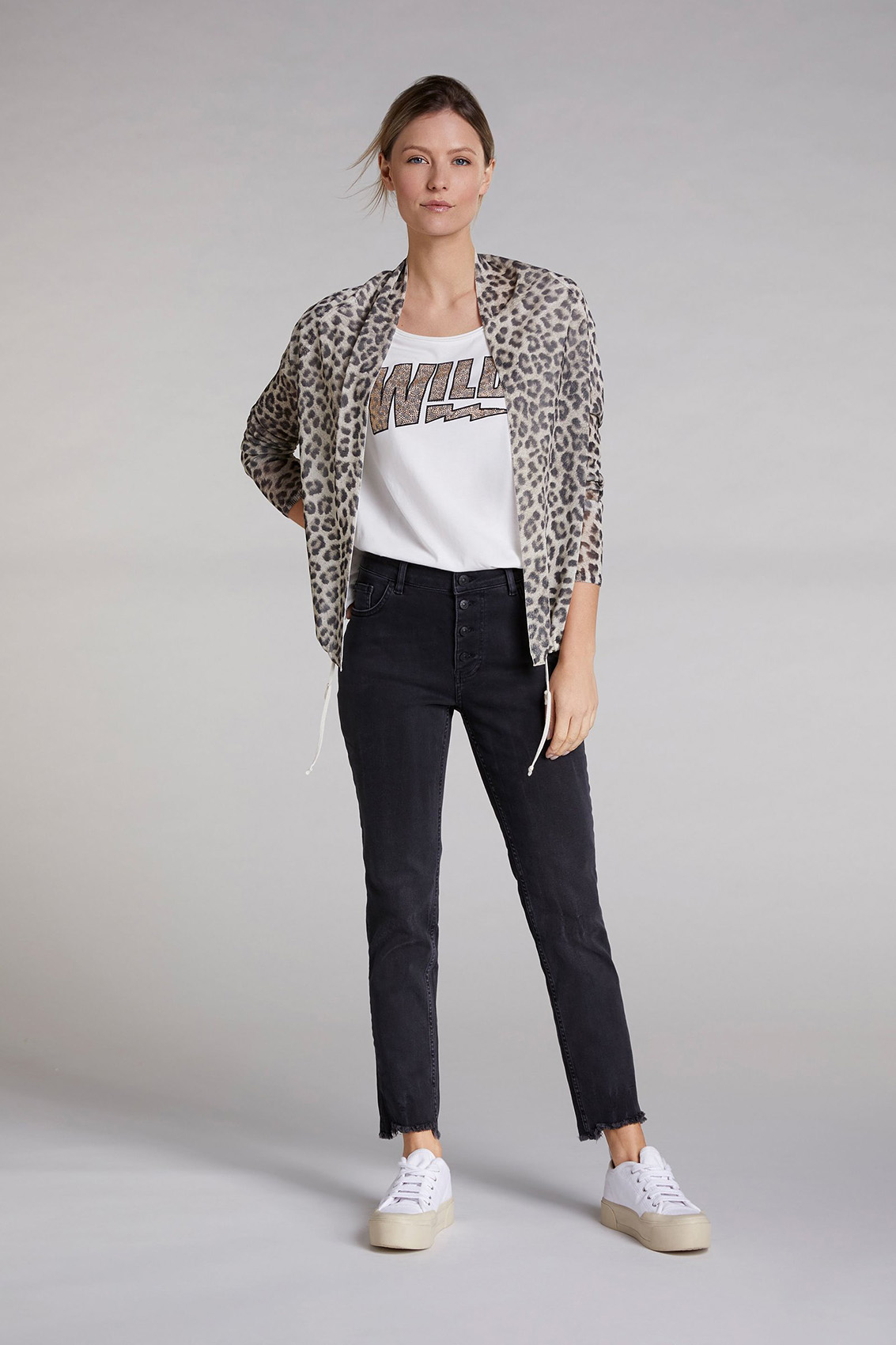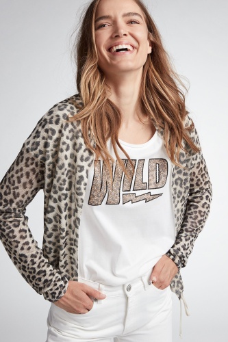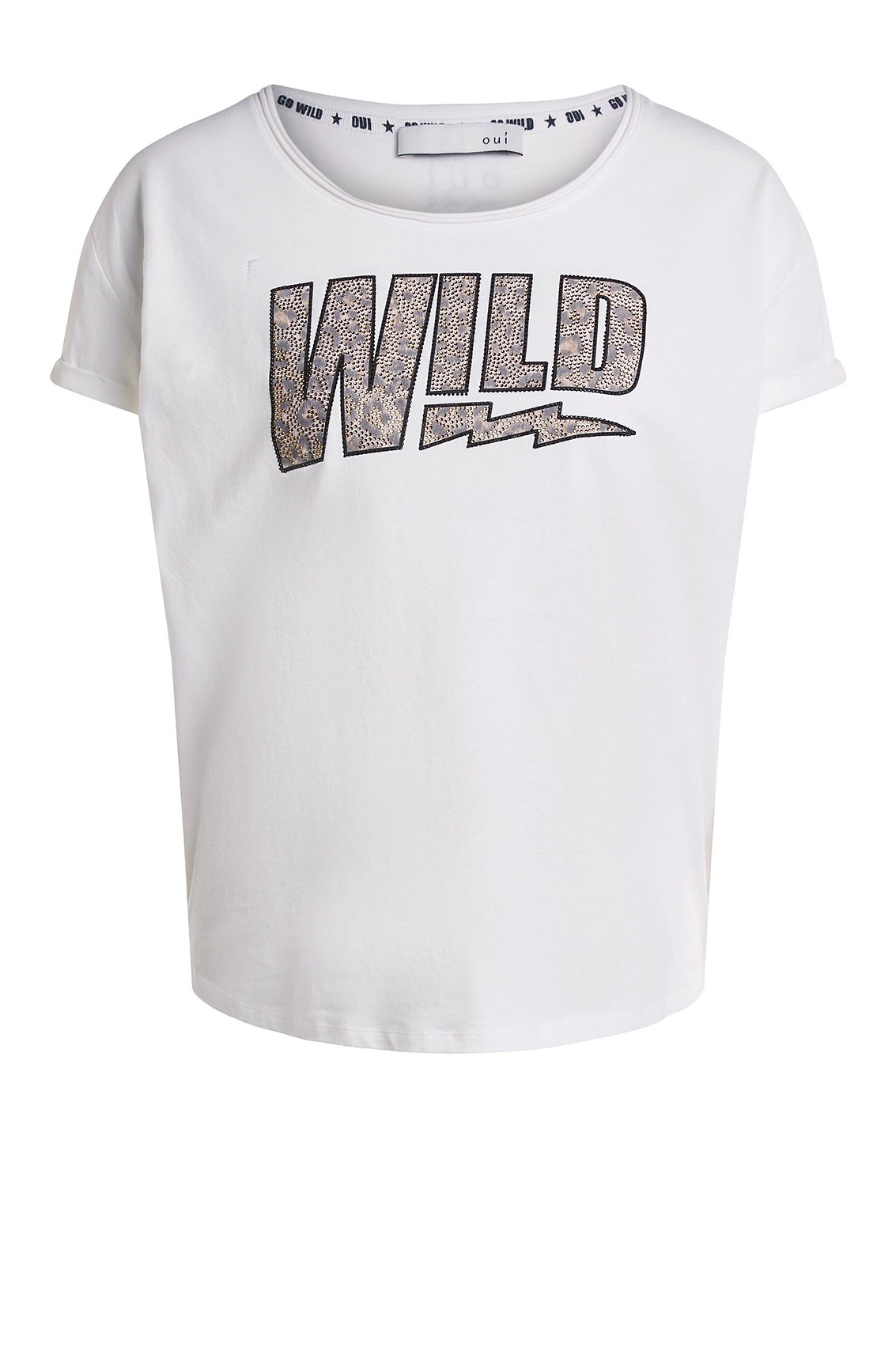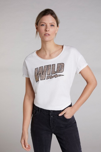 Свобода в тренде! Футболка свободного покроя. Широкий круглый вырез горловины, короткие рукава со спущенным плечом. Стильный акцент в дизайне - украшенный стразами принт. Хлопковый материал приятен к телу и обеспечивает комфорт. Эта модель - замечательная основа для создания образов в стиле кэжуал.