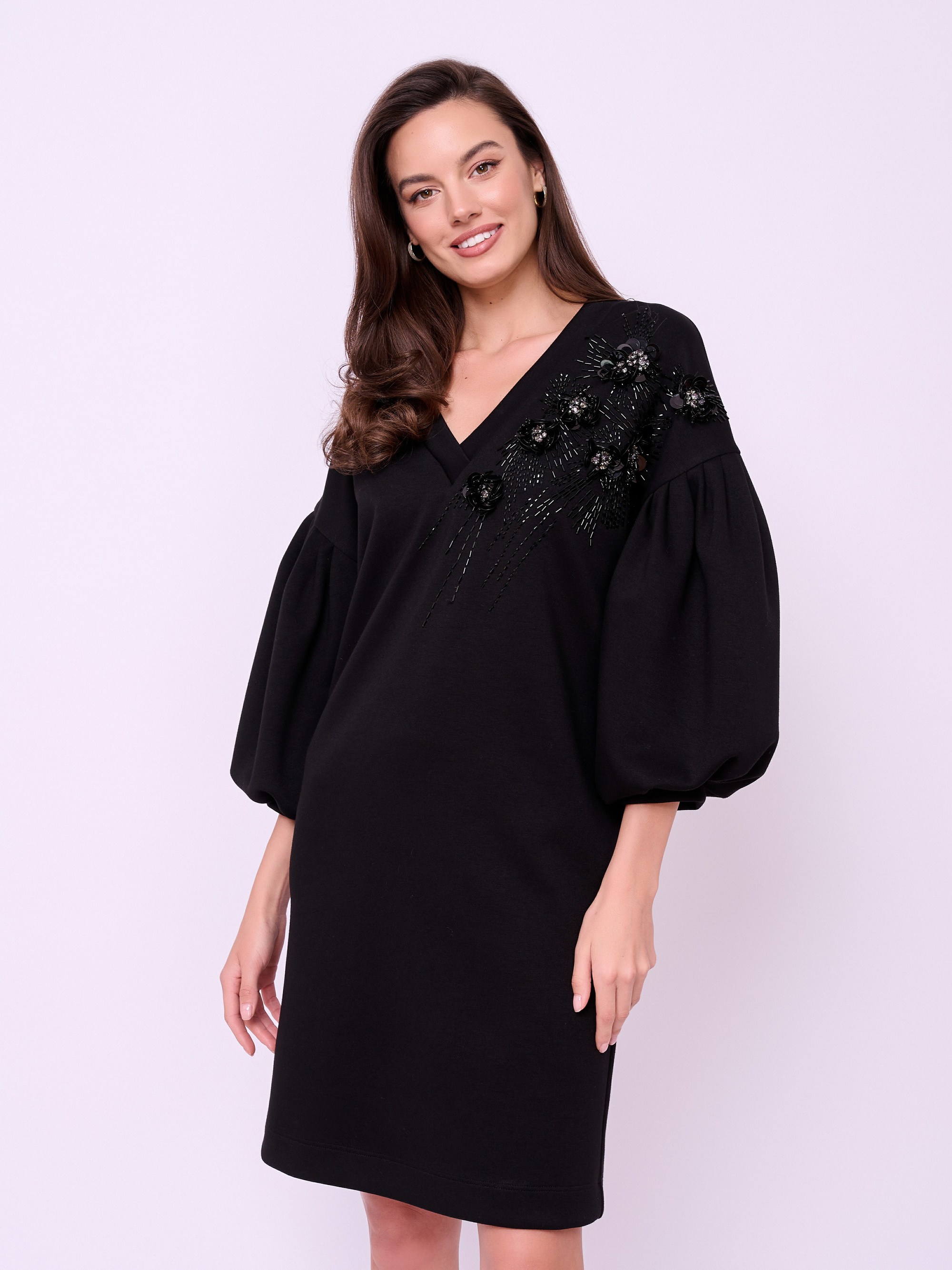 Платье средней длины без застежки, с V-образным вырезом горловины, объемными рукавами 7/8, карманами в боковых швах и вышивкой из бисера, пайеток и кристаллов. Длина по спинке: 91 см.