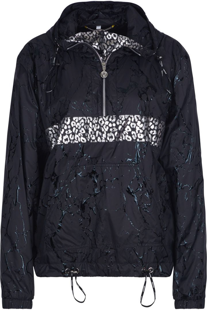 Анорак с анималистичным принтом по всей поверхности изделия. Модель украшают серебряная полоска на груди и спине. Дышащая сетка внутри куртки. Карман-клатч, молния на груди, капюшон и подол на кулиске делают образ одновременно элегантным и спортивным. Идеальная вещь для прогулок в городе и на природе.