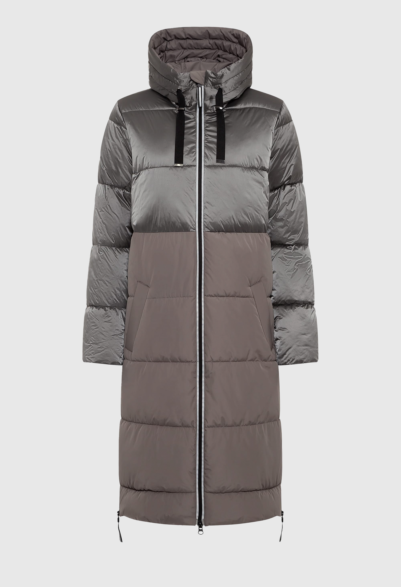 В куртке-пальто сочетаются блестящие матовые ткани одного тона. Широкие молнии по бокам на подоле для расширения формы, функциональная кулиска на капюшоне, двойная молния и потайной внутренний карман. Эта куртка обладает водоотталкивающими свойствами и содержит усовершенствованный синтетический термоизоляционный материал
