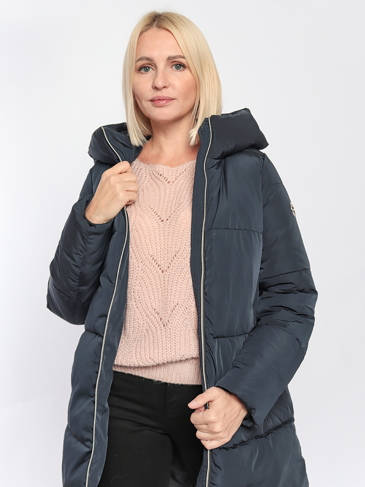 Темно-синее пальто с синтепоновым наполнителем – универсальная модель, хорошо сочетается с различными нарядами. Объемный капюшон, застежка на двойную молнию. Два боковых кармана с листочкой.