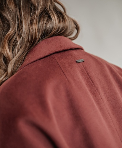 Пальто прямого силуэта длиной выше колена. Втачной рукав, застёжка на пришивные кнопки, английский воротник, горизонтальный подрез на полочке и спинке, вертикальные карманы-листочки.
