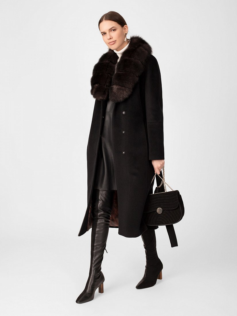 Пальто прилегающего силуэта из шерстяной ворсовой ткани чёрного цвета со съёмным воротником из натурального песца в росшив. Длина ниже колена. Рукава-кимоно с подрезом по низу, застёжка на пришивные кнопки, карманы в рельефах, английский воротник, пояс, шлица в среднем шве спинки. Произведено с ветрозащитной мембраной Raft Pro. Утеплитель DuPont Sorona из биопуха.