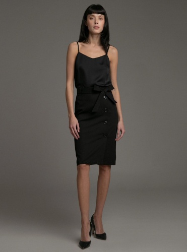 Пуговицы в тренде. Вариация на тему юбка-карандаш. Пуговицы спереди делают модель маст-хэв сезона, а пояс в форме банта создает дополнительный акцент на талии и придает женственности строгому силуэту.