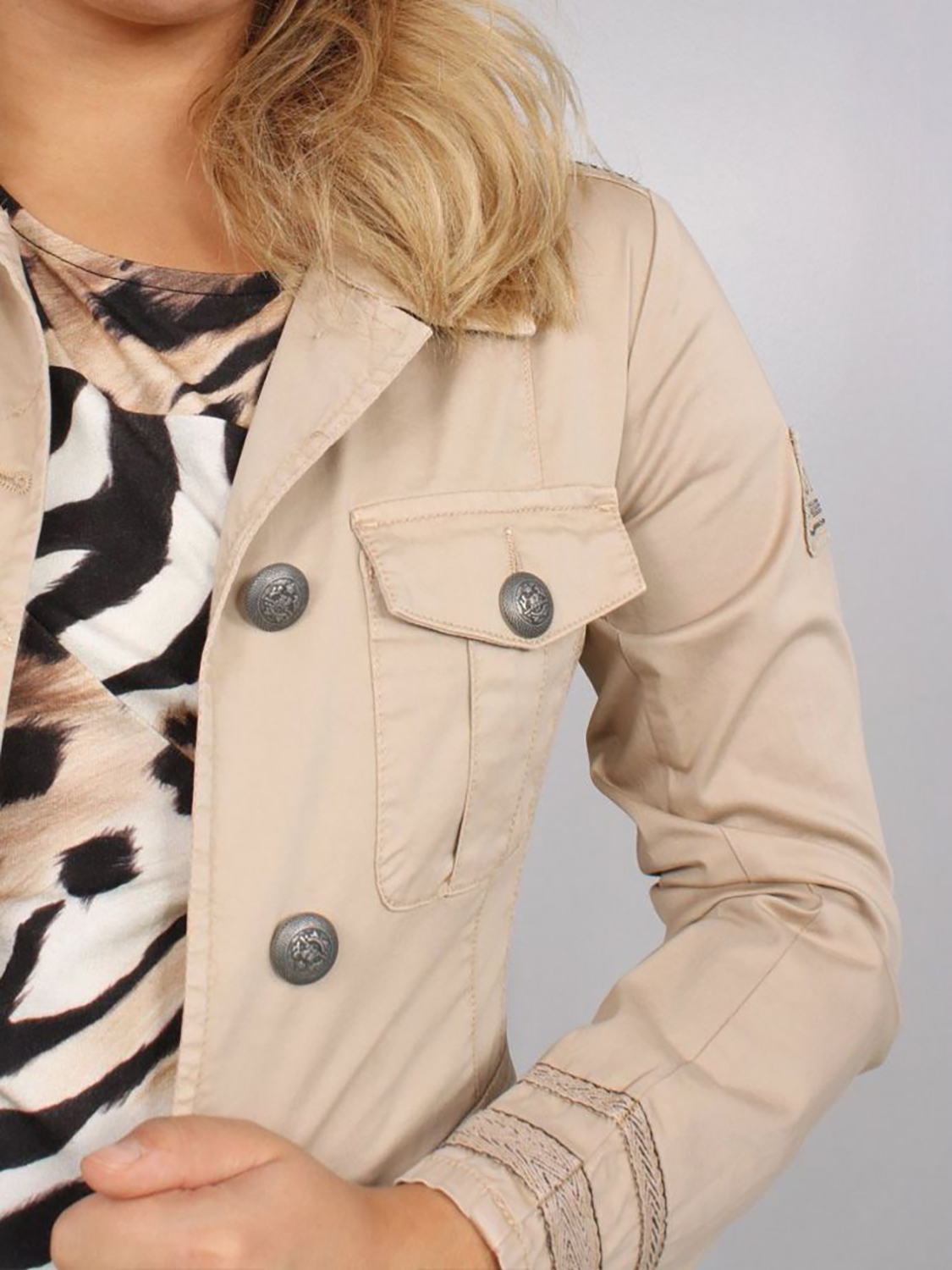 На сайте указаны Российские размеры. Однотонный жакет – универсальный элемент гардероба, подходит для повседневного, городского лука. Отложной рубашечный воротник, застежка на пуговицы. Четыре накладных кармана с клапаном.