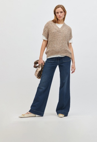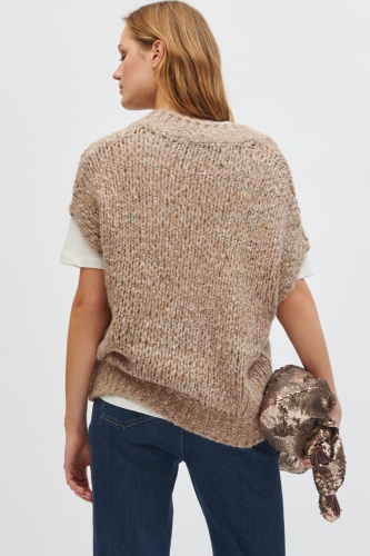 На сайте указаны российские размеры. Жилет из итальянской разноцветной твидовой пряжи с добавлением кашемира и шелка. Легкая открытая отделка идеально дополняет объемный силуэт с V-образным вырезом и заниженной линией плеч. Наша модель ростом 178 см.