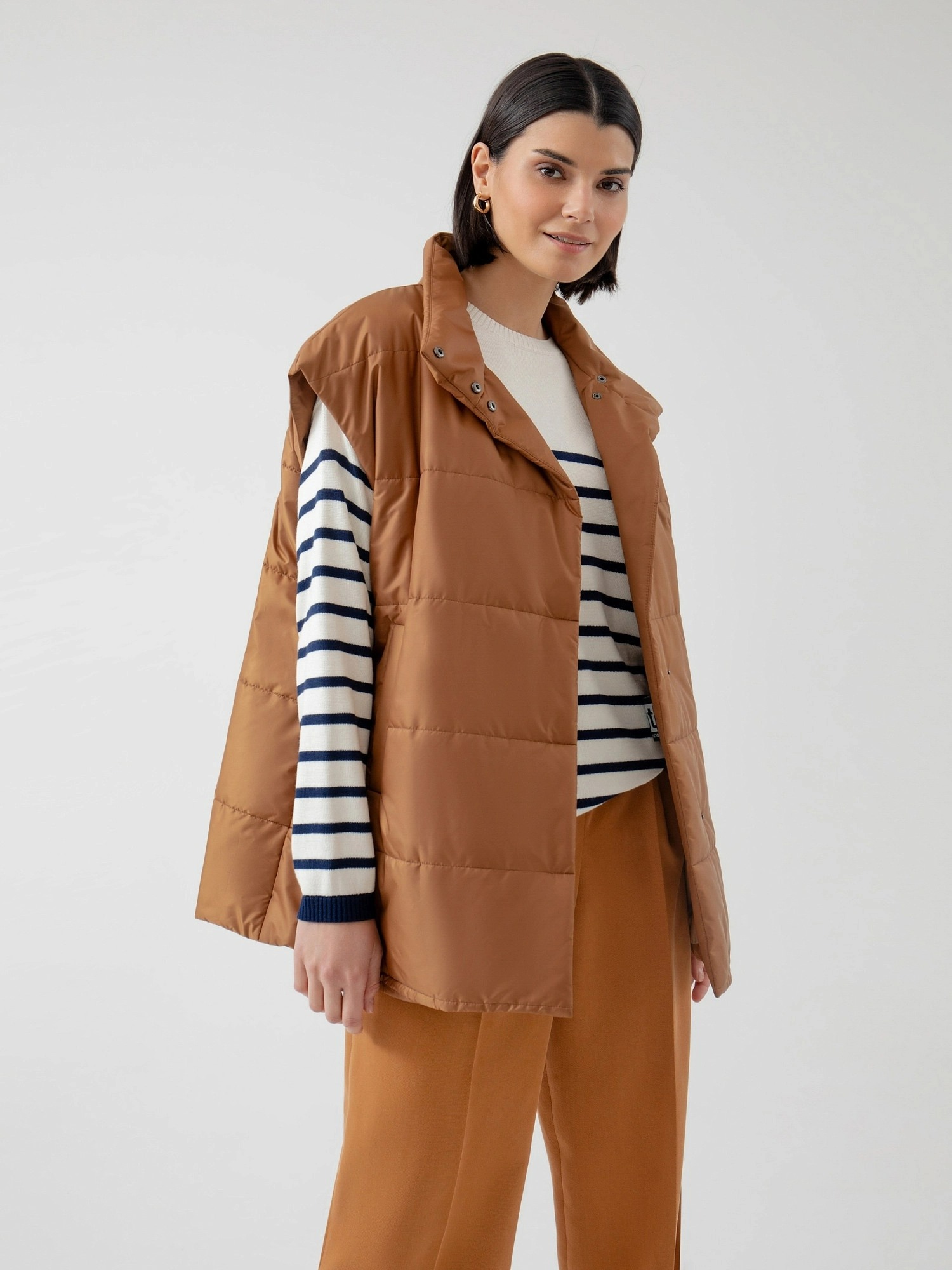 На сайте указаны российские размеры. Стеганый жилет в роскошном медовом цвете из плотной и мягкой плащевой ткани. Жилет выполнен на утеплителе, что сделает Ваш образ не только стильным, но и очень теплым. Воротник-стойка имеет комфортную посадку, которая не стеснит движений и при этом будет надежно защищать от ветра. В качестве дополнительного декоративного элемента в комплекте идет пояс, который сделает силуэт более женственным и утонченным. Для дополнительной защиты от ветра жилет выполнен с использованием мембраны RaftPro. Длина изделия 73 см. Рост модели 175 см.