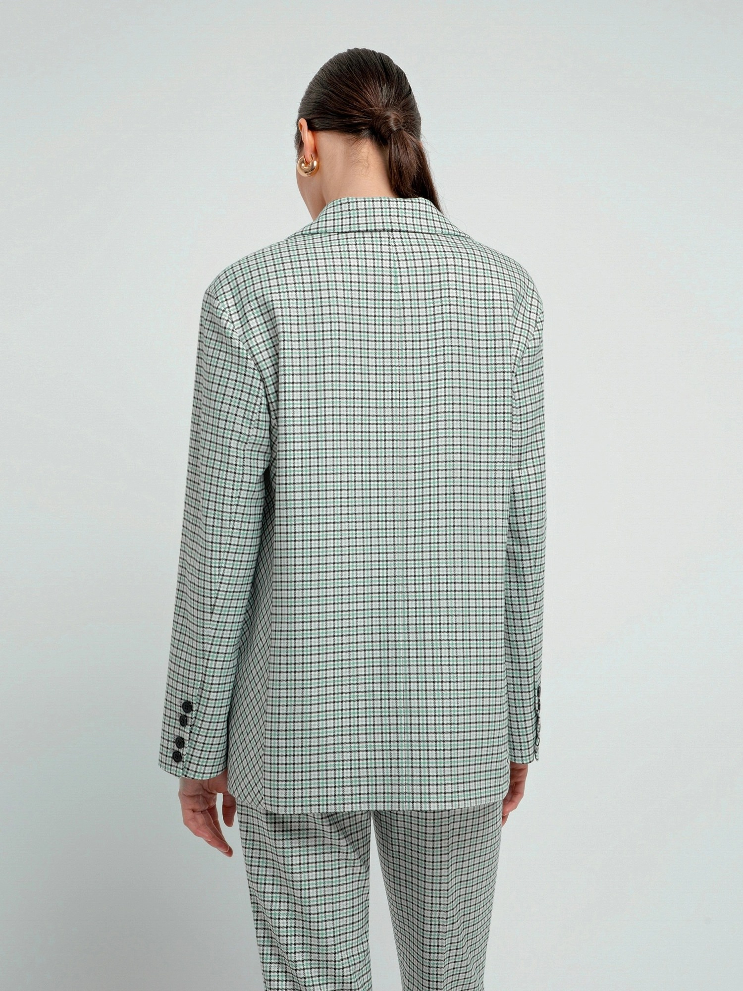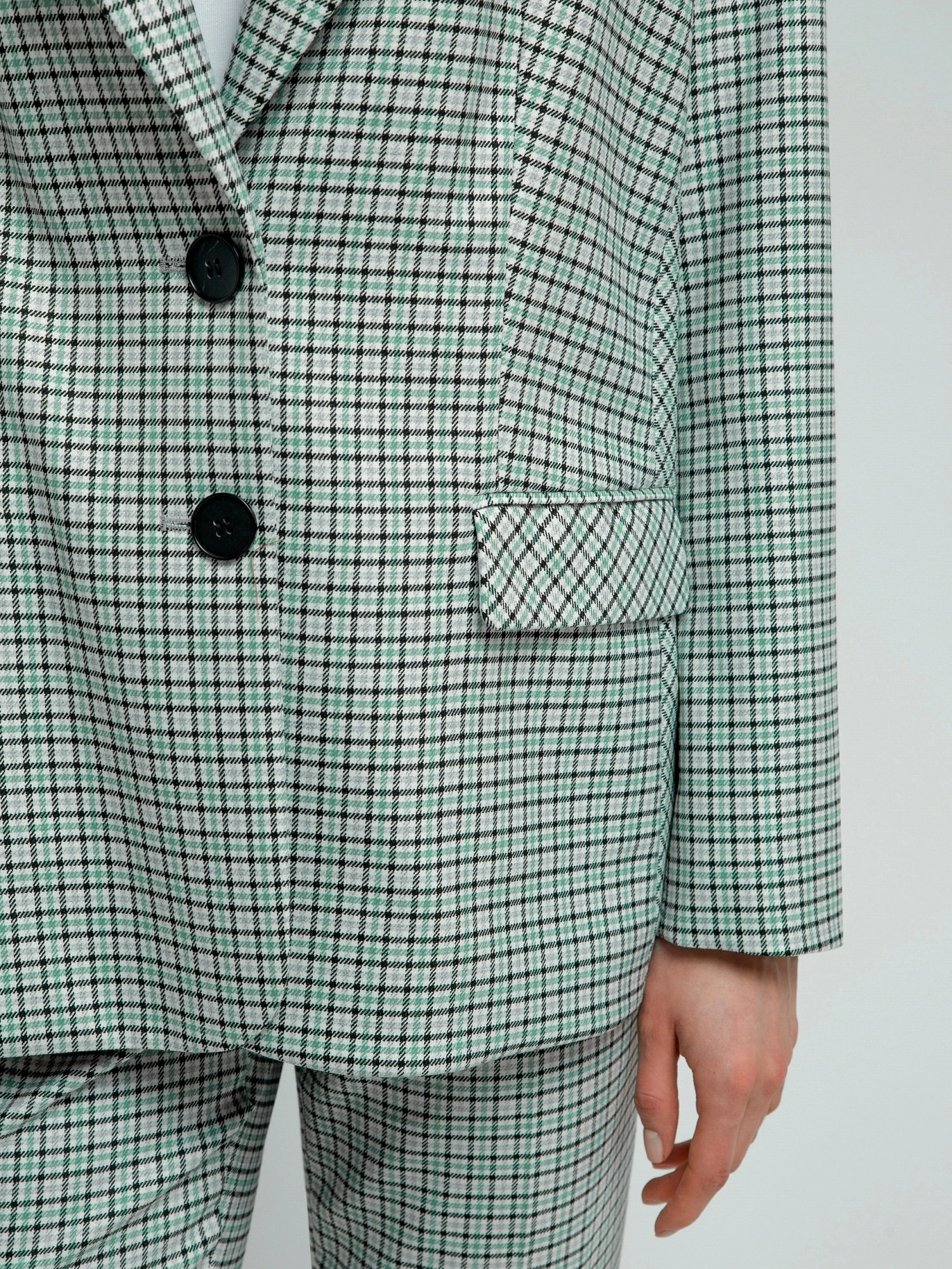На сайте указаны российские размеры. Однобортный жакет на подкладке со спущенной линией плеча и округлыми лацканами. Жакет выполнен из костюмной ткани в мелкую клетку серо-бирюзового цвета. Рост модели 175 см.