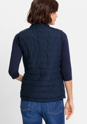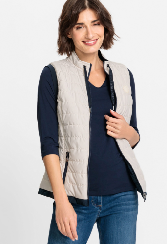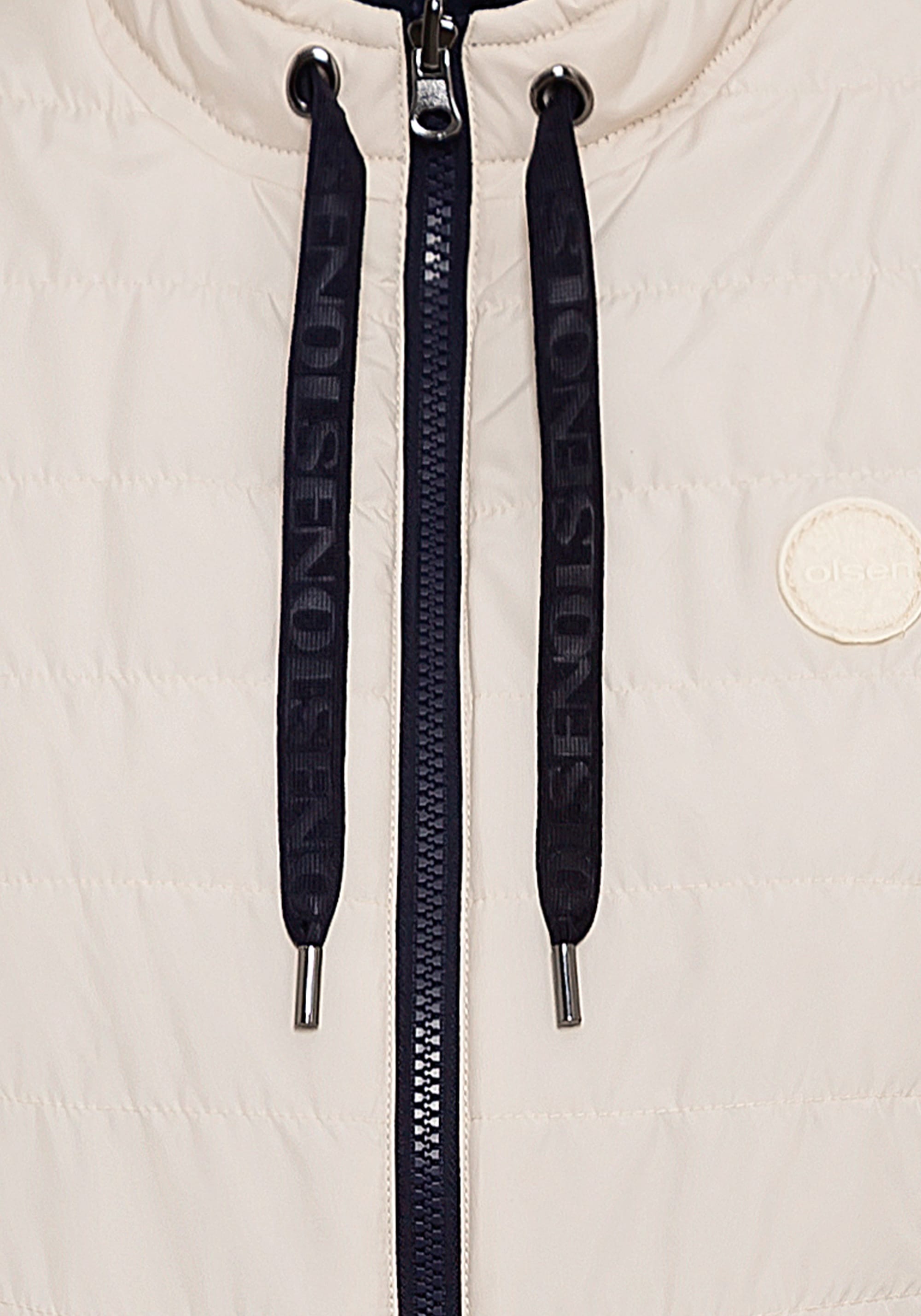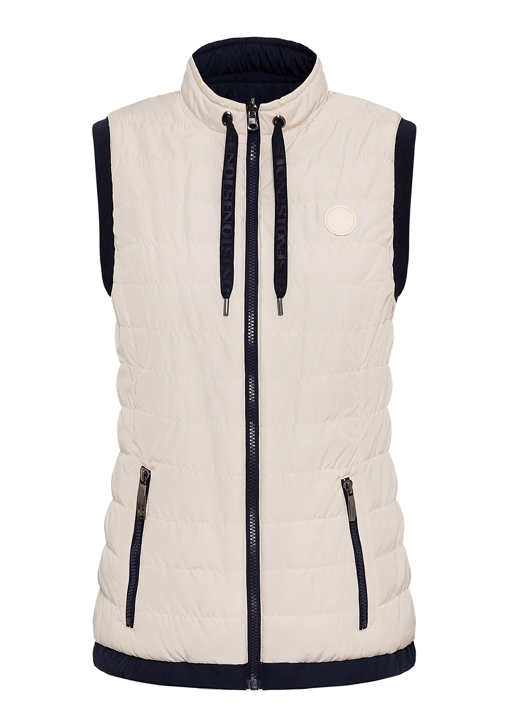 Жилет двусторонний, и его можно носить двумя способами в зависимости от вашего настроения и образа. Стильные особенности включают фирменную нашивку Olsen на груди, двойную застежку-молнию, два передних кармана на молнии и функциональные завязки на высоком воротнике. Кремовый — можно носить перевернутым, как чернильно-синий.