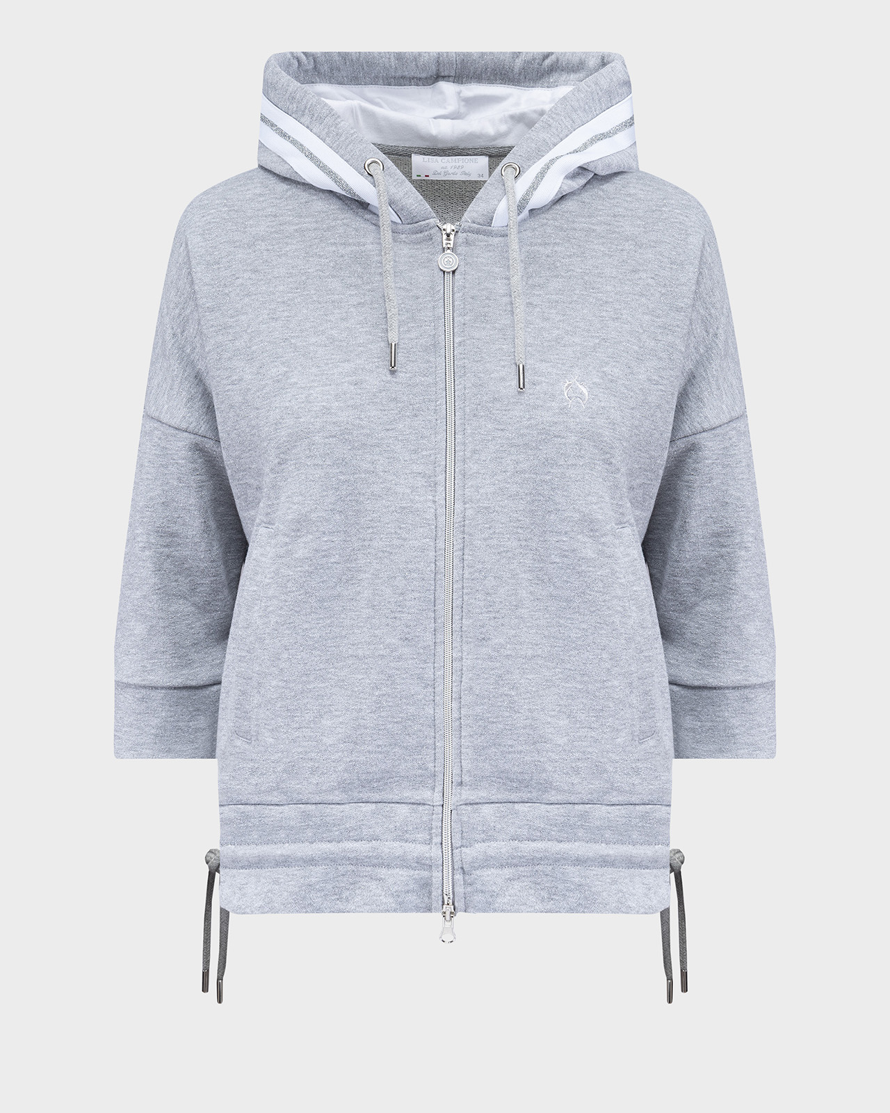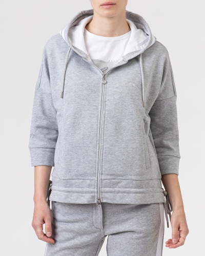Блейзер прямого кроя с капюшоном в спортивном стиле. Застежка на молнию, втачные рукава ¾ со спущенной линией плеч. Блейзер удачно сочетать с брюками в тон из той же коллекции бренда.